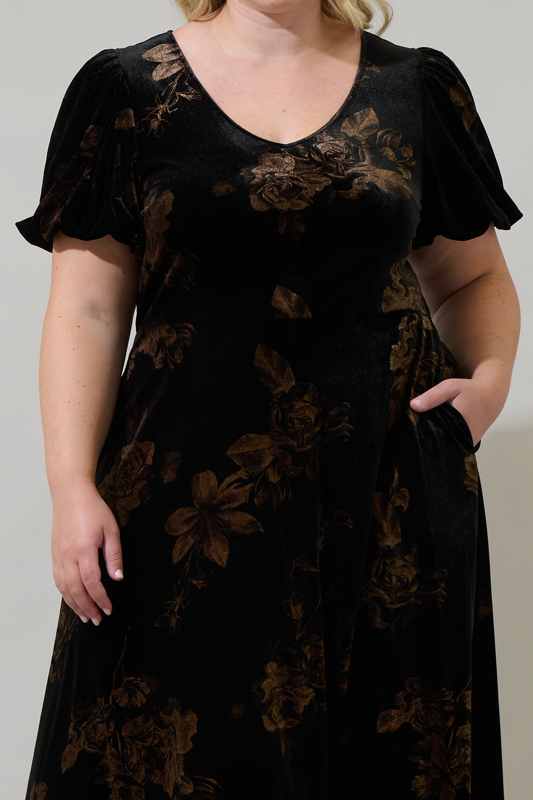 Be the best dressed at your next event with the help of the Ace Floral Abrina Flared Midi Dress. A soft velvet floral print designs this dress with short puff sleeves and a v-neckline. It has pockets on each side and is flared from the bottom skirt. Wear black heels to go along this dress.
