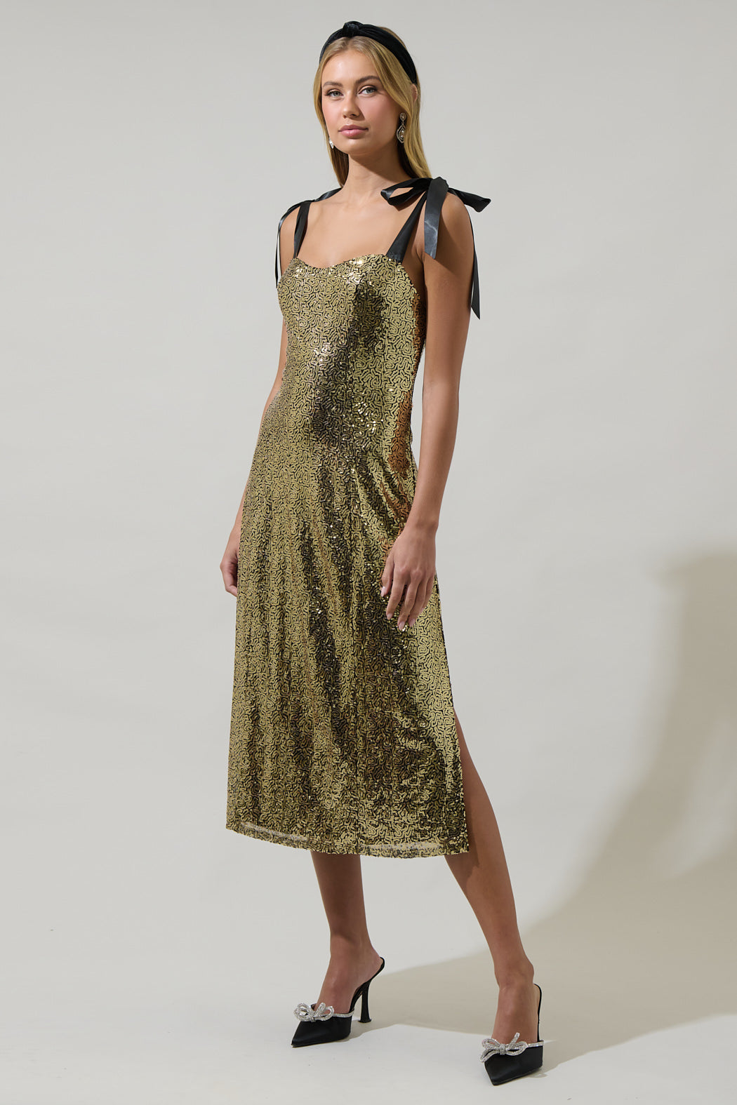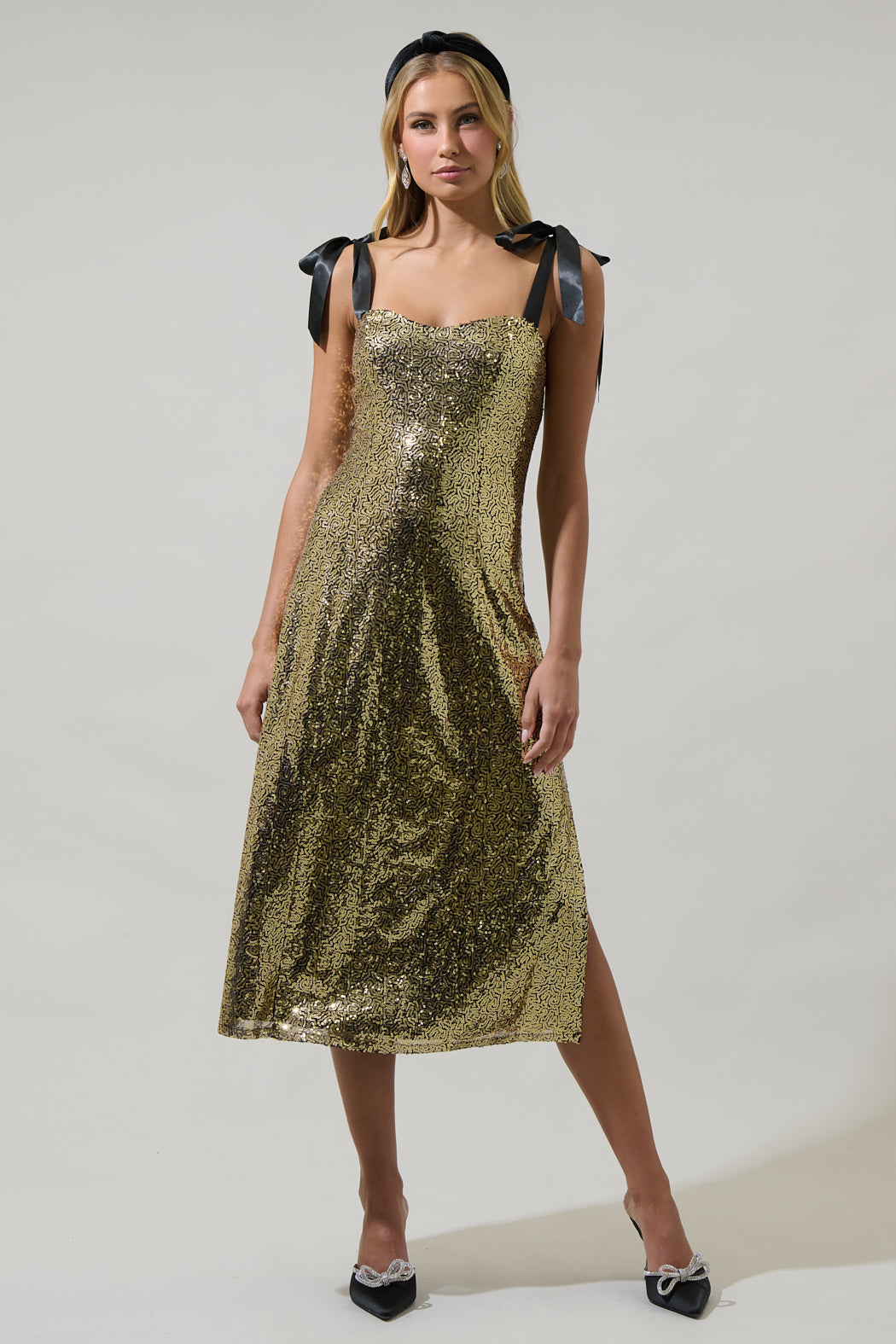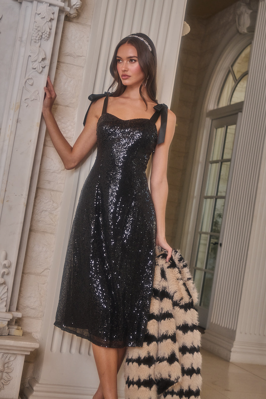 Add a pop of fun into your weekend wardrobe with this Adelisa Sequin Tie Strap Midi Dress. Shinny sequin fabric makes a sweet heart neckline with tying shoulder straps. The back has an invisible zipper and ends at a midi length. Pair it up with strappy heels.