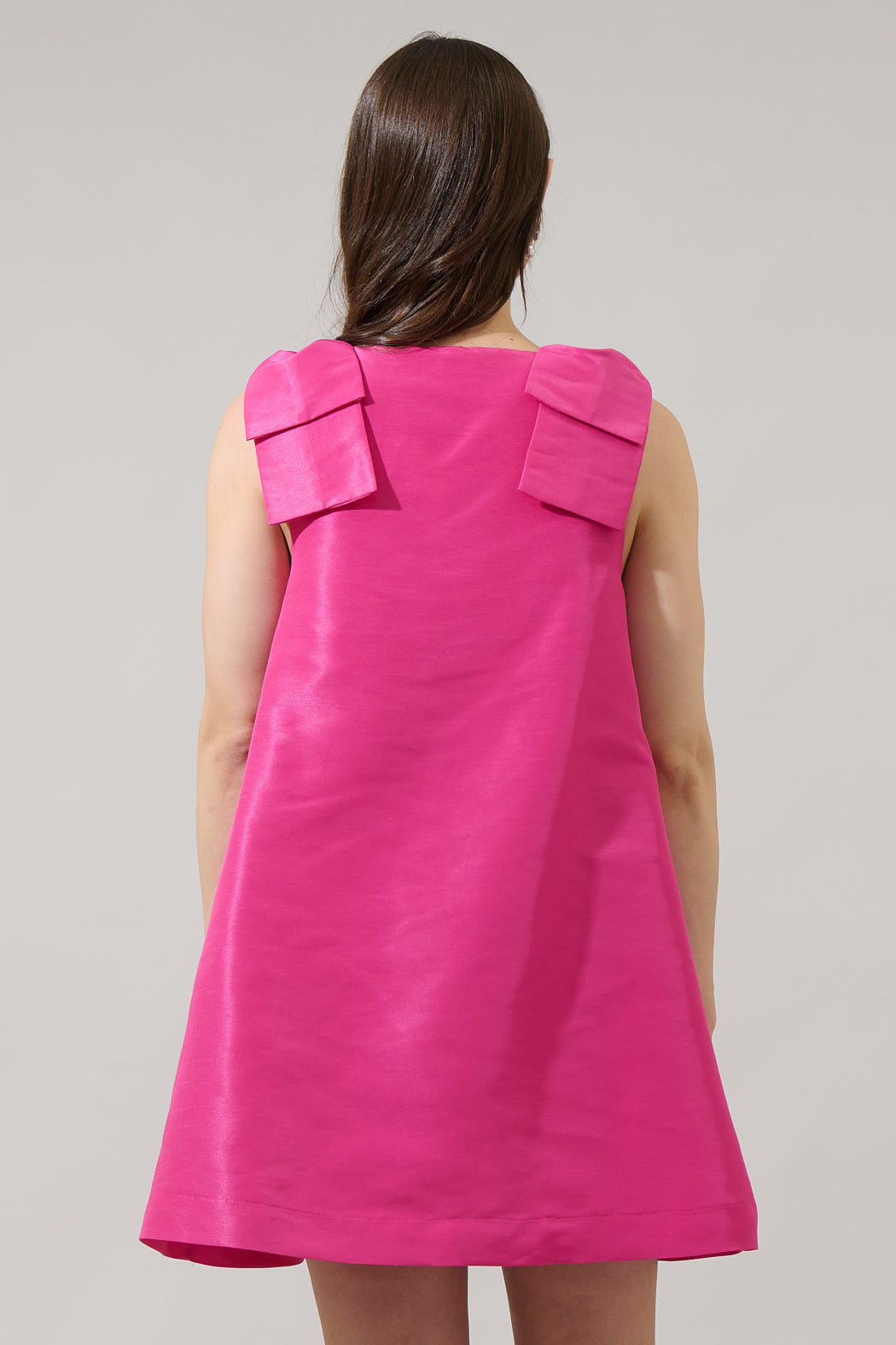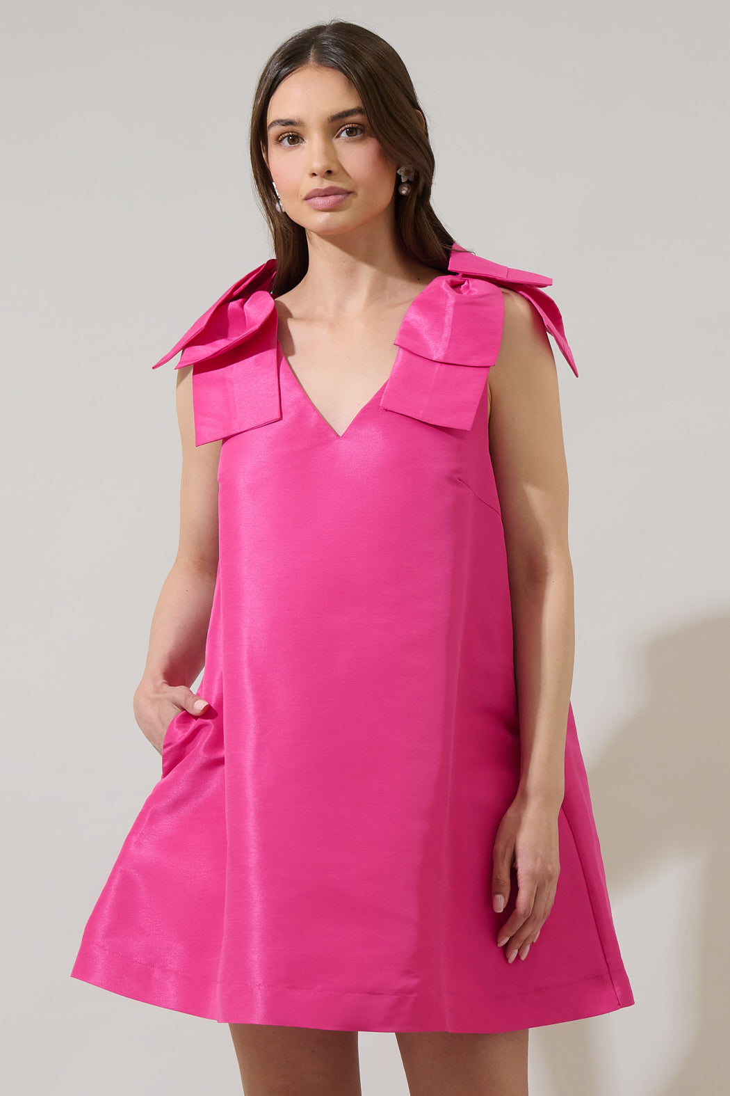 Get ready for an ultimate sassy look with this Alani Bow Trapeze Mini Dress. A shoulder bow detail frames a v neckline with a sleeveless look. The body has a trapeze style, creating a loose effect. Wear it with strappy heels and you’re good to go.