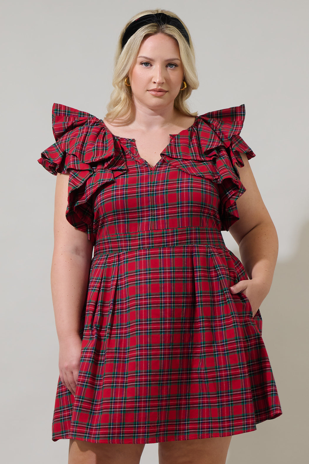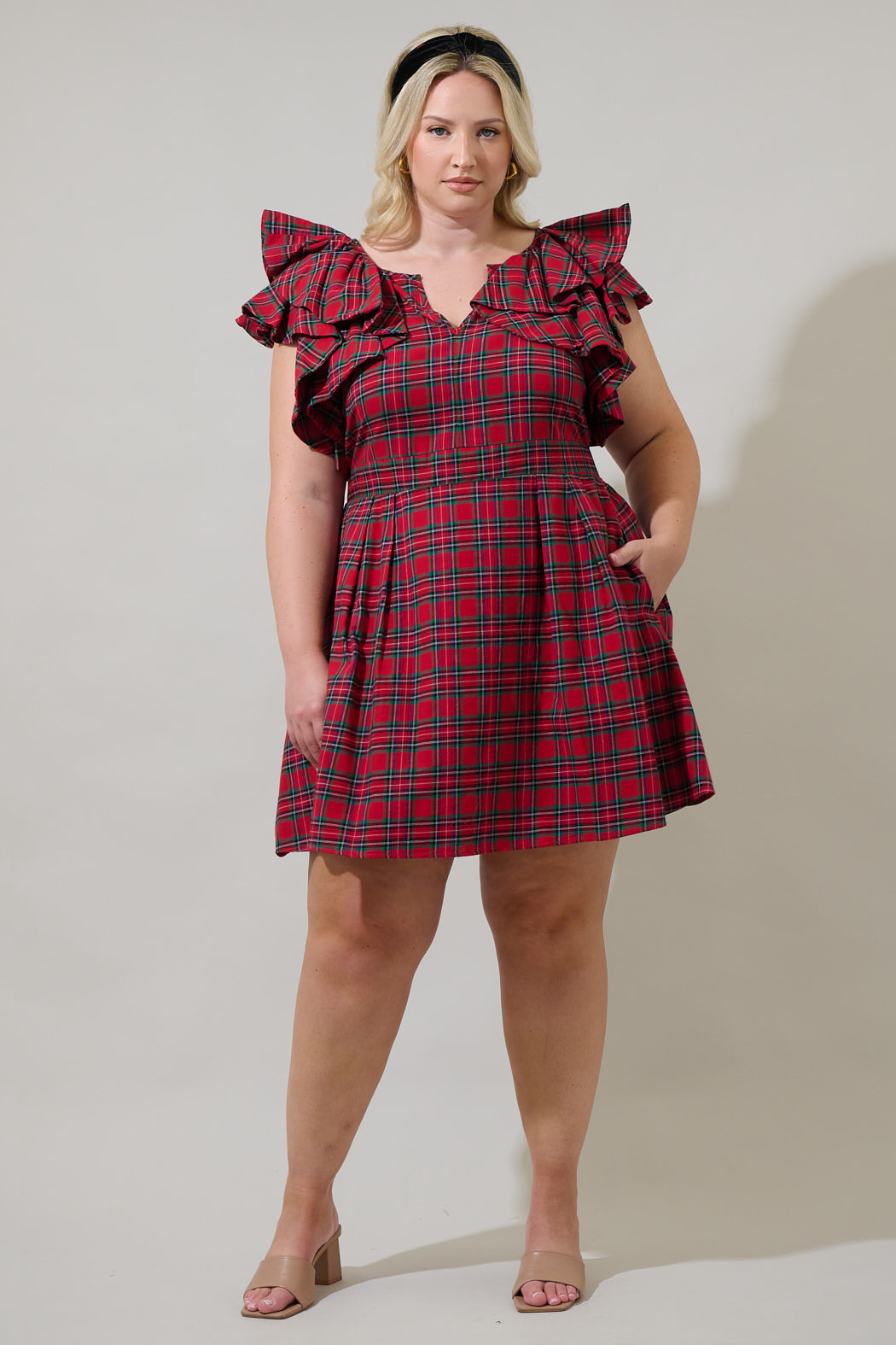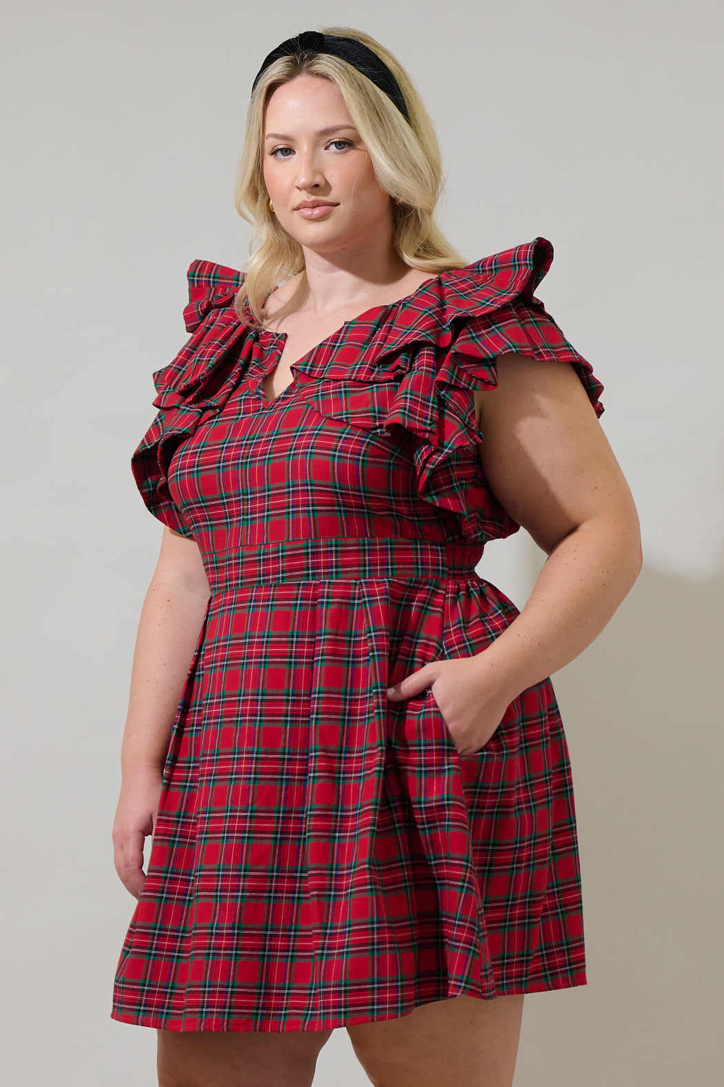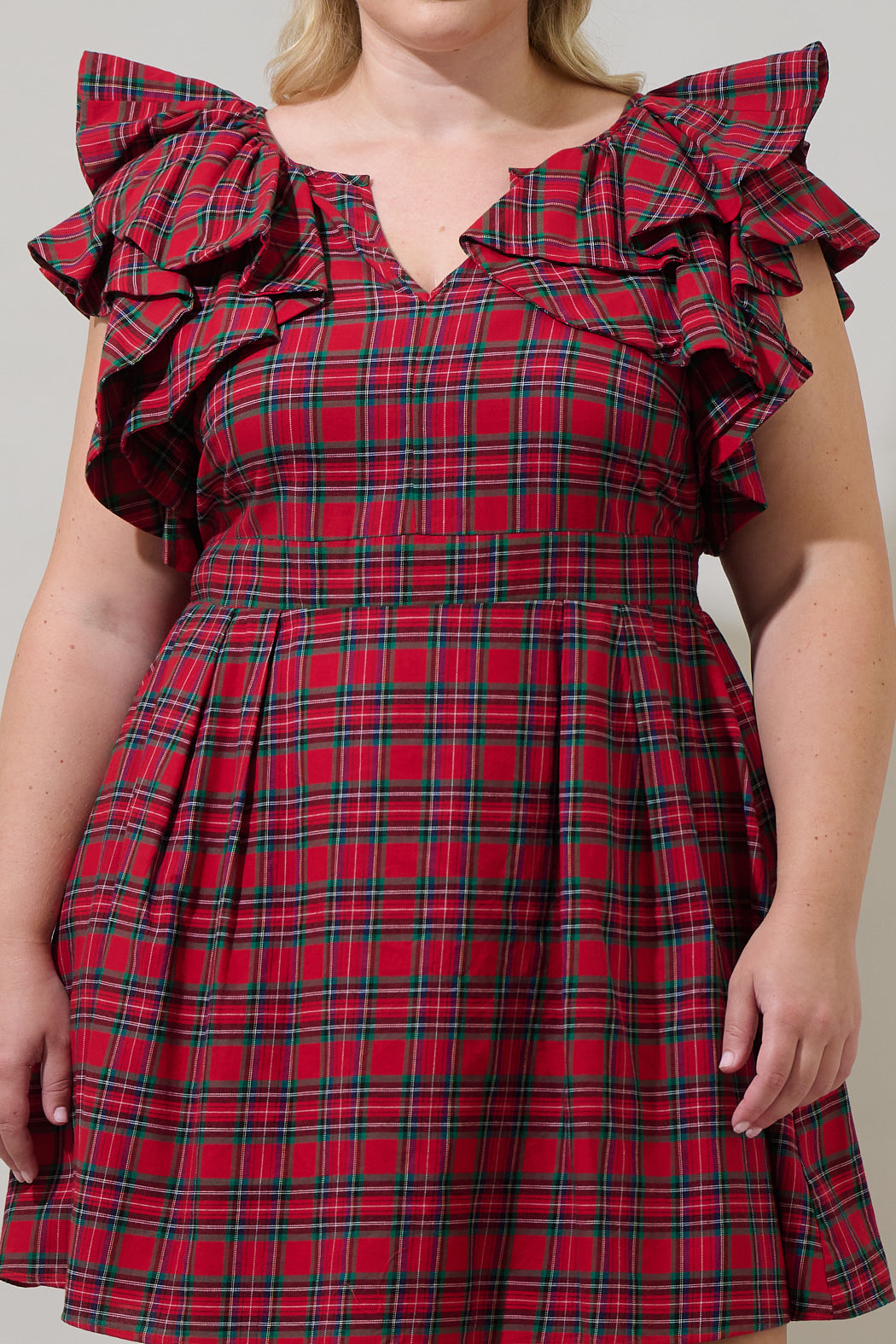Enhance your autumn aesthetic with the help of the Arvada Plaid Wilma Ruffle Mini Dress. Layered ruffles on the shoulders are followed by a split neckline. The skirt has small pleats giving it that extra touch. Pair it with strappy heels and a black bag to go along