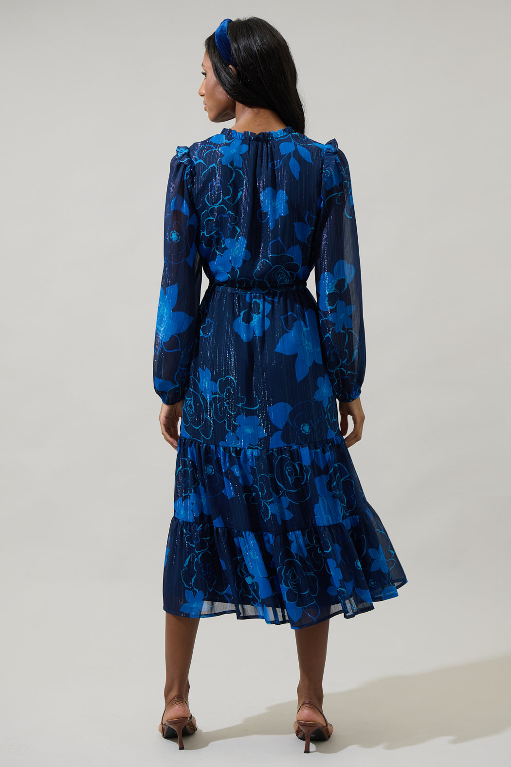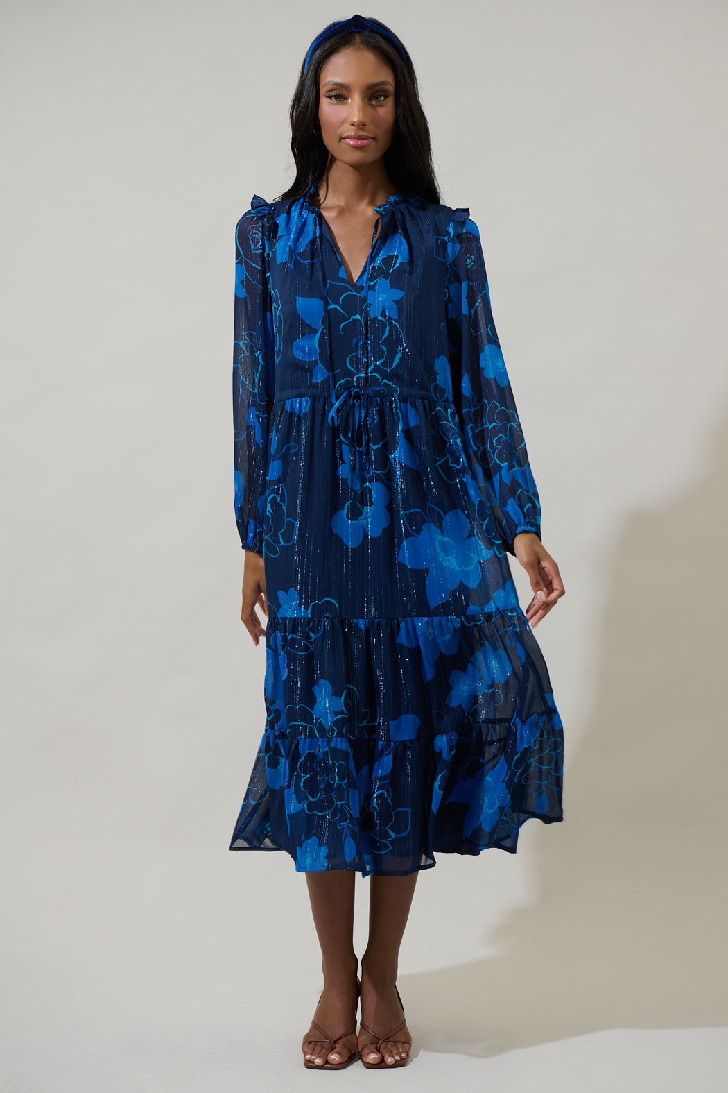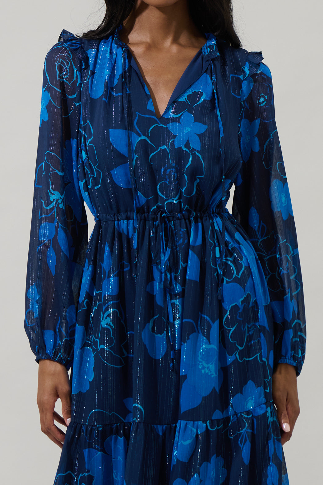 The Bluford Floral puts a stylish spin on a classic Kristen Tiered Midi Dress. It features a ruffle trim split neckline with tie details attached. A sheer ruffle sits at the shoulder seam of long, flowy balloon sleeves that frame a tiered, lined midi skirt. Adjust the waist with a drawstring tie. Pair it with wedges or open toe strappy heels.