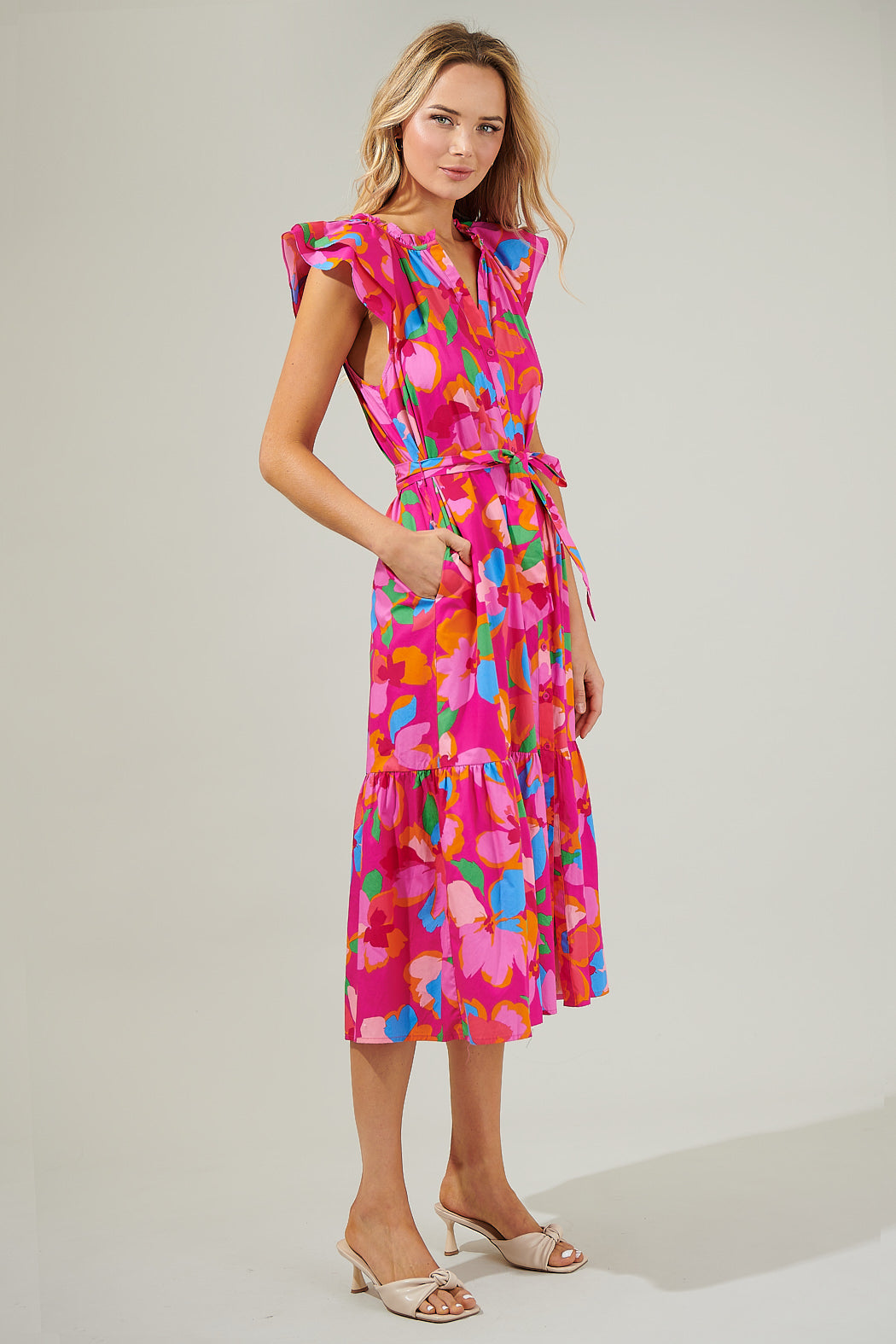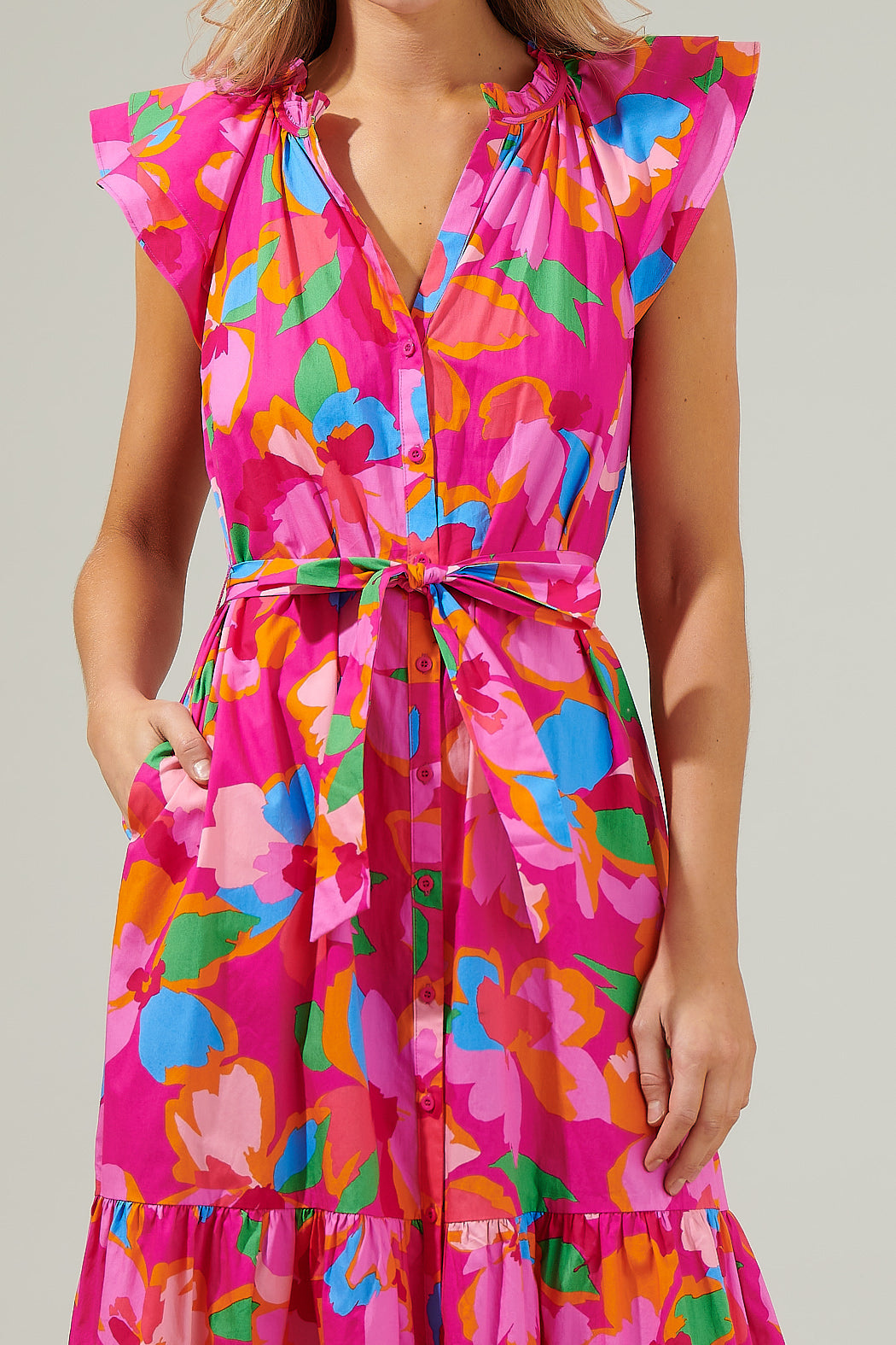 We're loving the crush-worthy vibes of the Daphne Floral Charlotte Button Midi Dress! It features a split neckline and a flare bodice, framed by short cap sleeves. A belt wrap around the waist and secure at the back, followed by a button-down design. You can pair it up with sandals or heels to match!