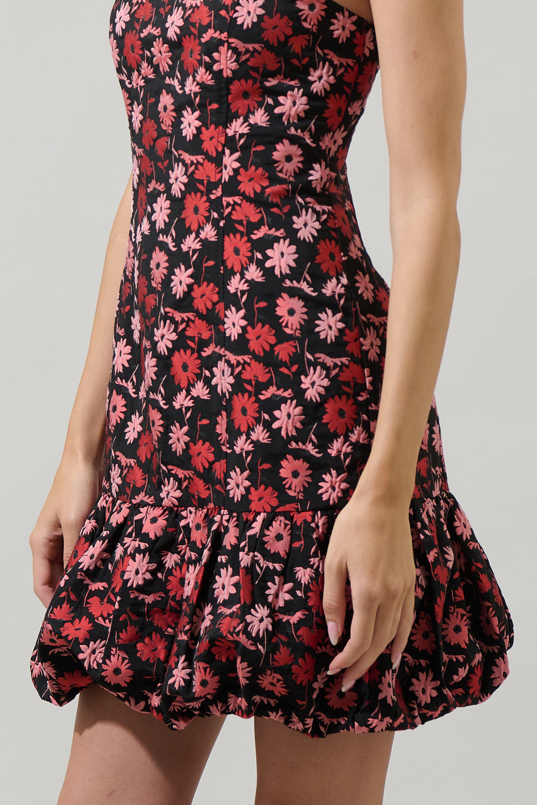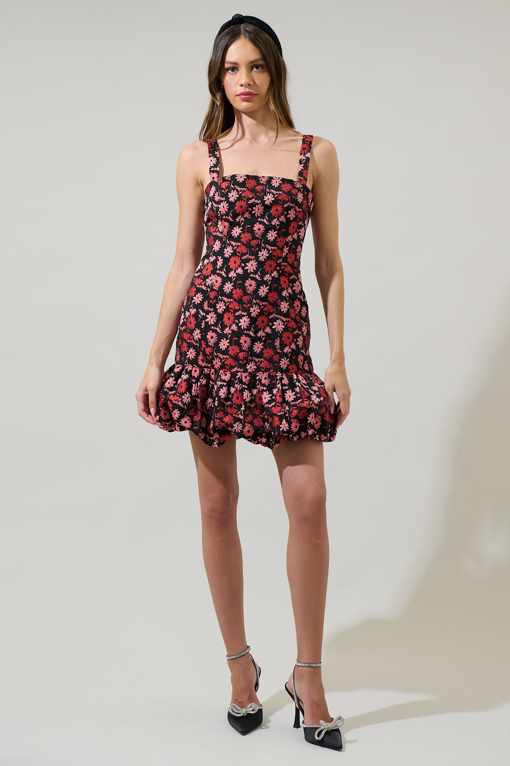 A night out on the town starts with this cute mini dress. A textured floral print stands out on this dress with a princess line, shoulder straps, and a bubble ruffle mini hem. It has an invisible zipper in the back. Wear it with heels or any shoes of your choice.