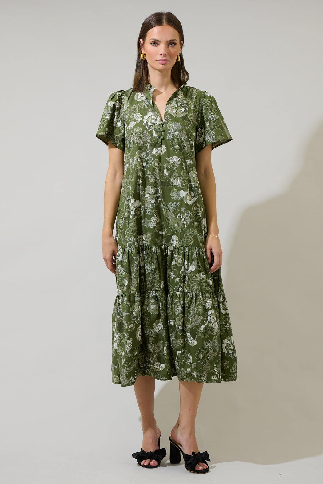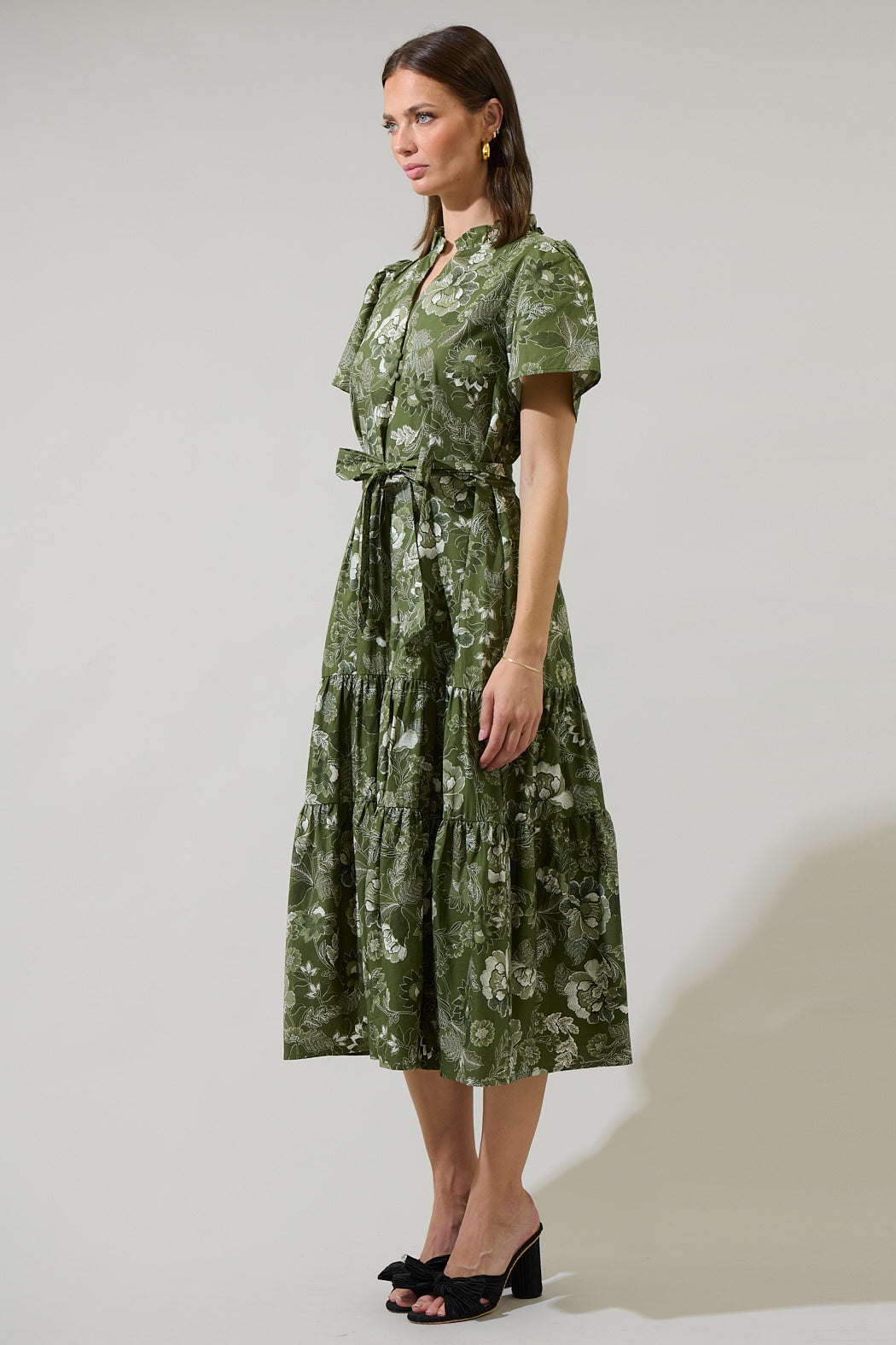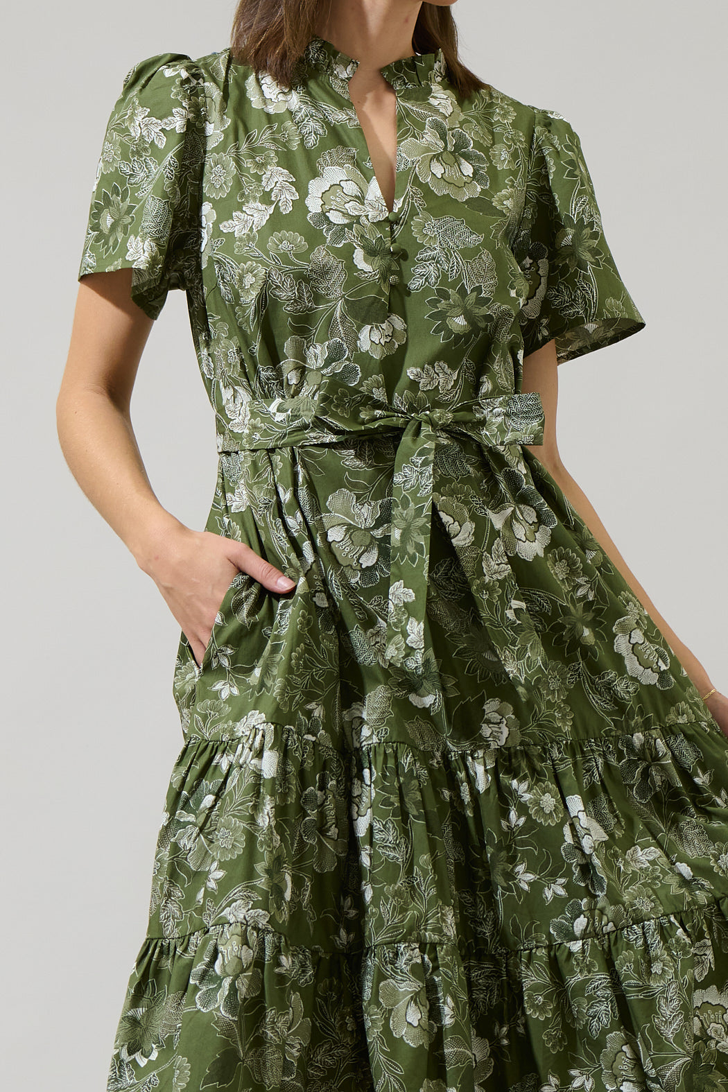 The Hazleton Floral Britt Poplin Tiered Midi Dress is one of kind. This midi dress has short sleeves that frame a split neckline with ruffles around and a lower button up detail. It has belt around the waist and tiered layers. You can easily style it with wedges or strappy heels.