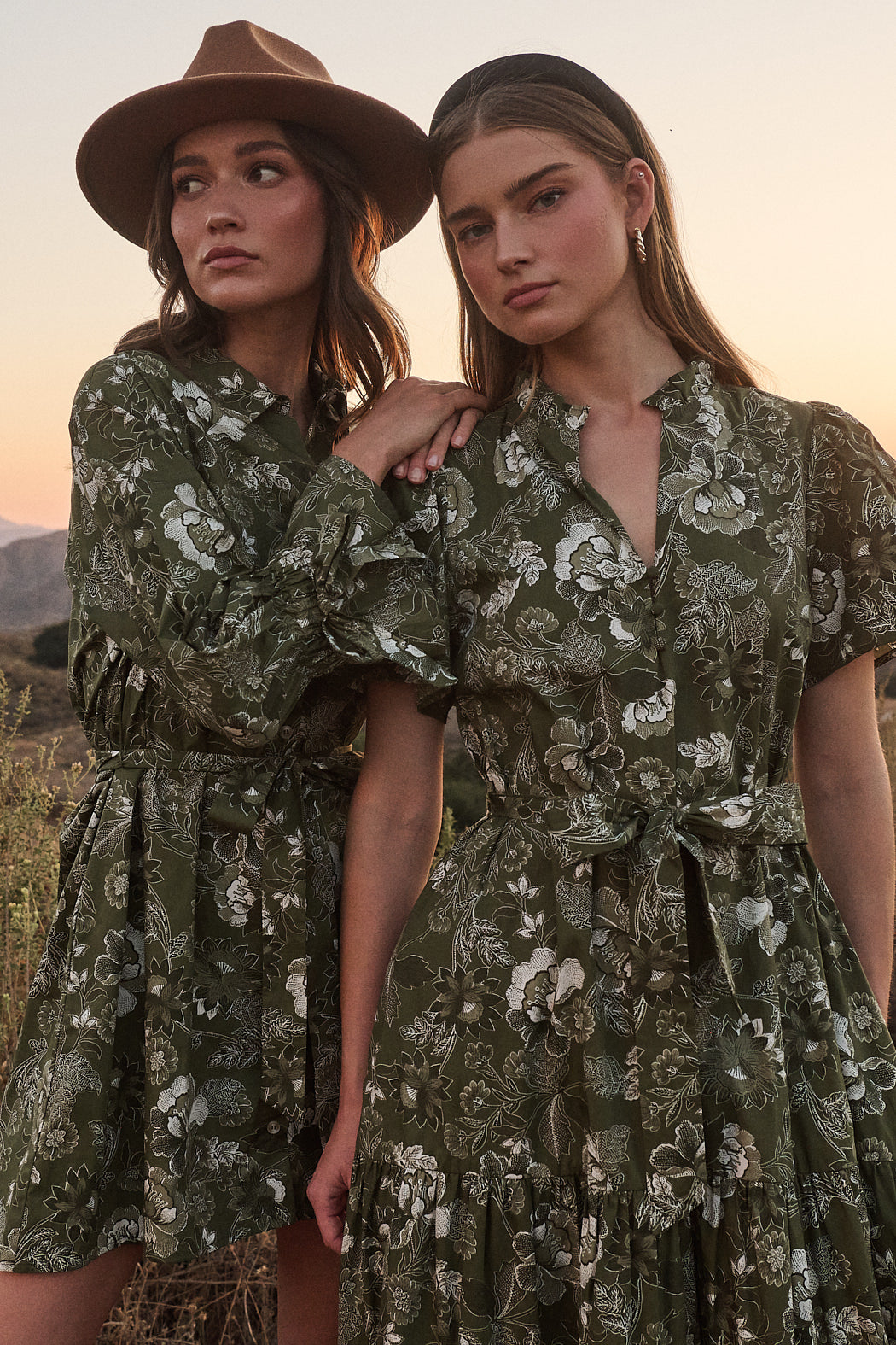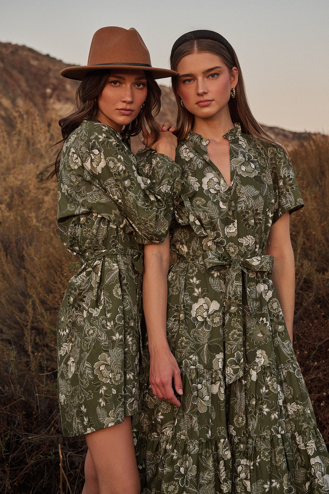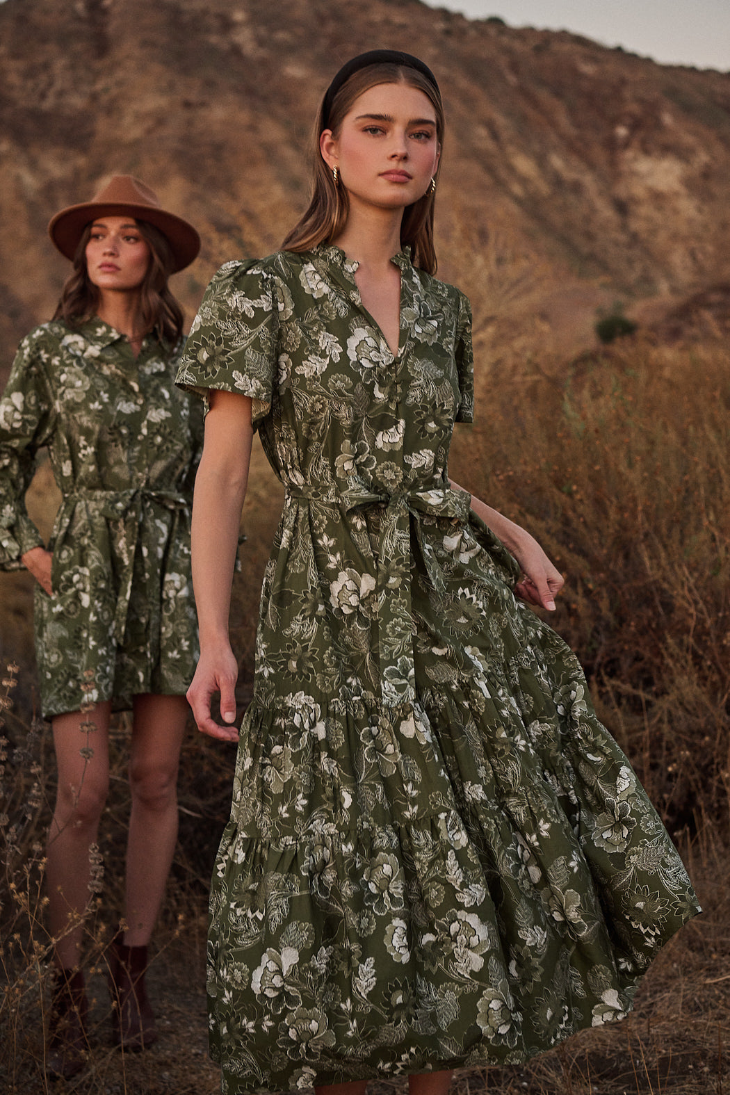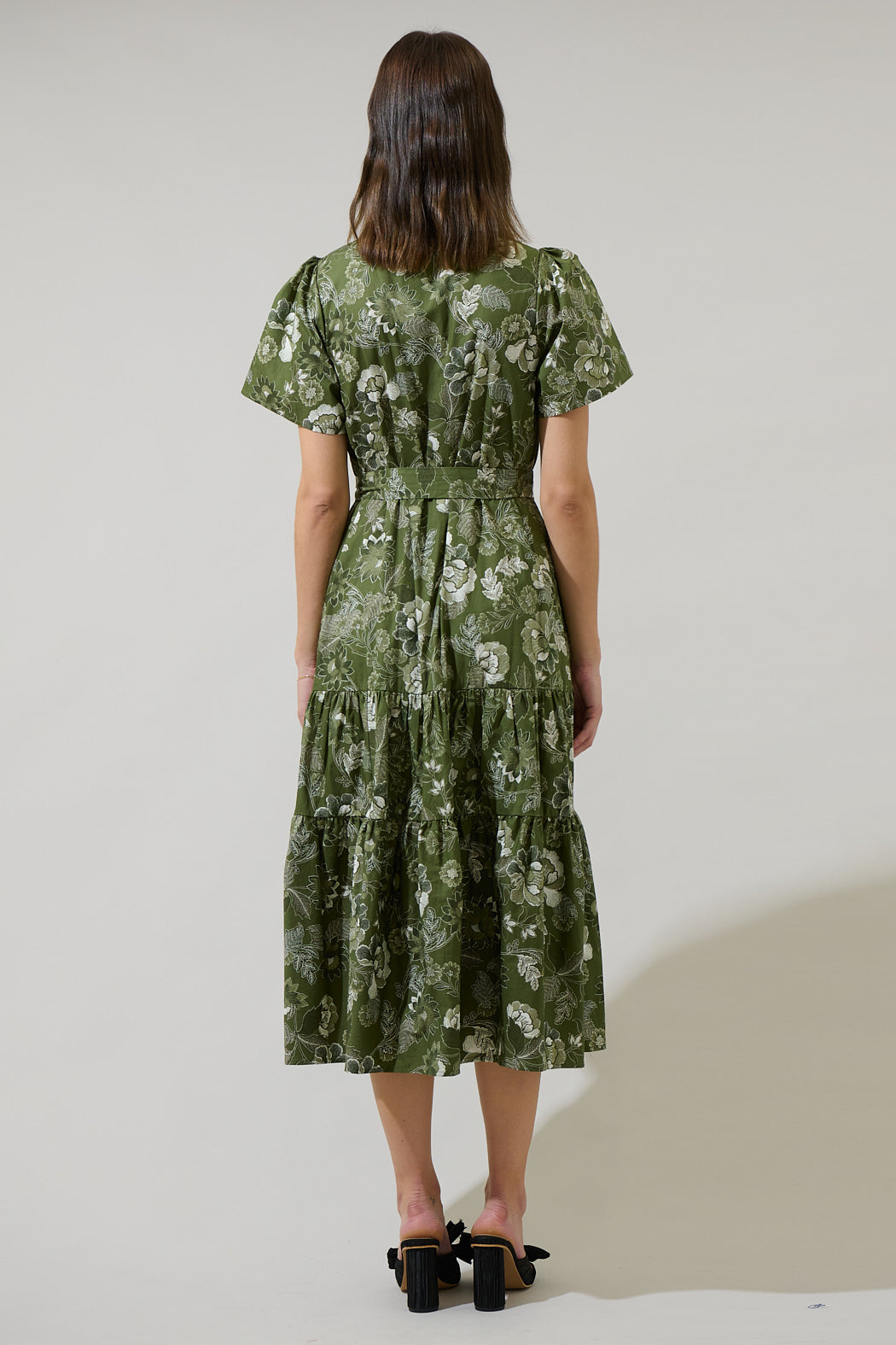 The Hazleton Floral Britt Poplin Tiered Midi Dress is one of kind. This midi dress has short sleeves that frame a split neckline with ruffles around and a lower button up detail. It has belt around the waist and tiered layers. You can easily style it with wedges or strappy heels.