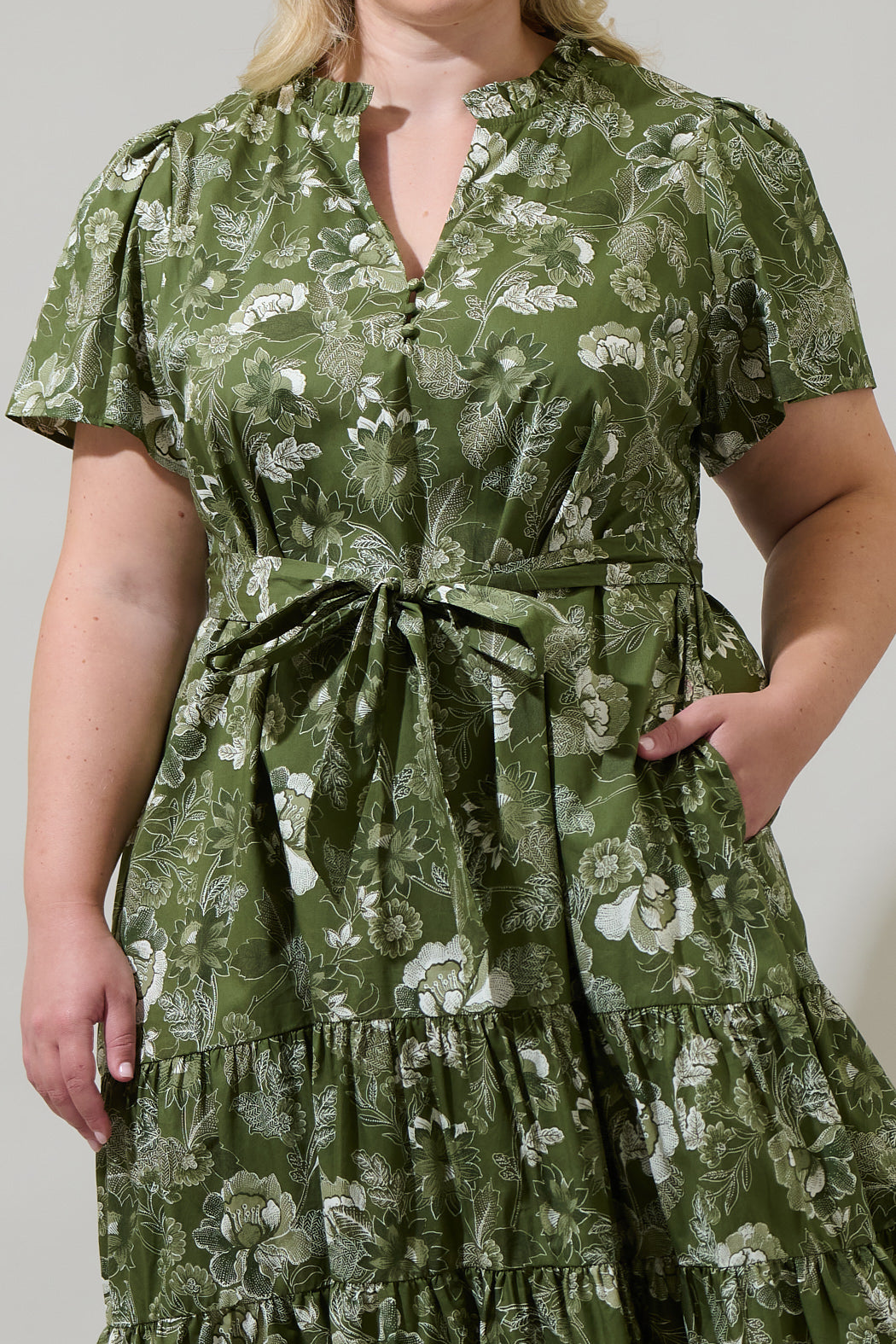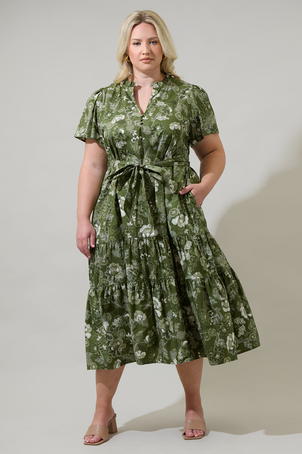 The Hazleton Floral Britt Poplin Tiered Midi Dress is one of kind. This midi dress has short sleeves that frame a split neckline with ruffles around and a lower button up detail. It has belt around the waist and tiered layers. You can easily style it with wedges or strappy heels.
