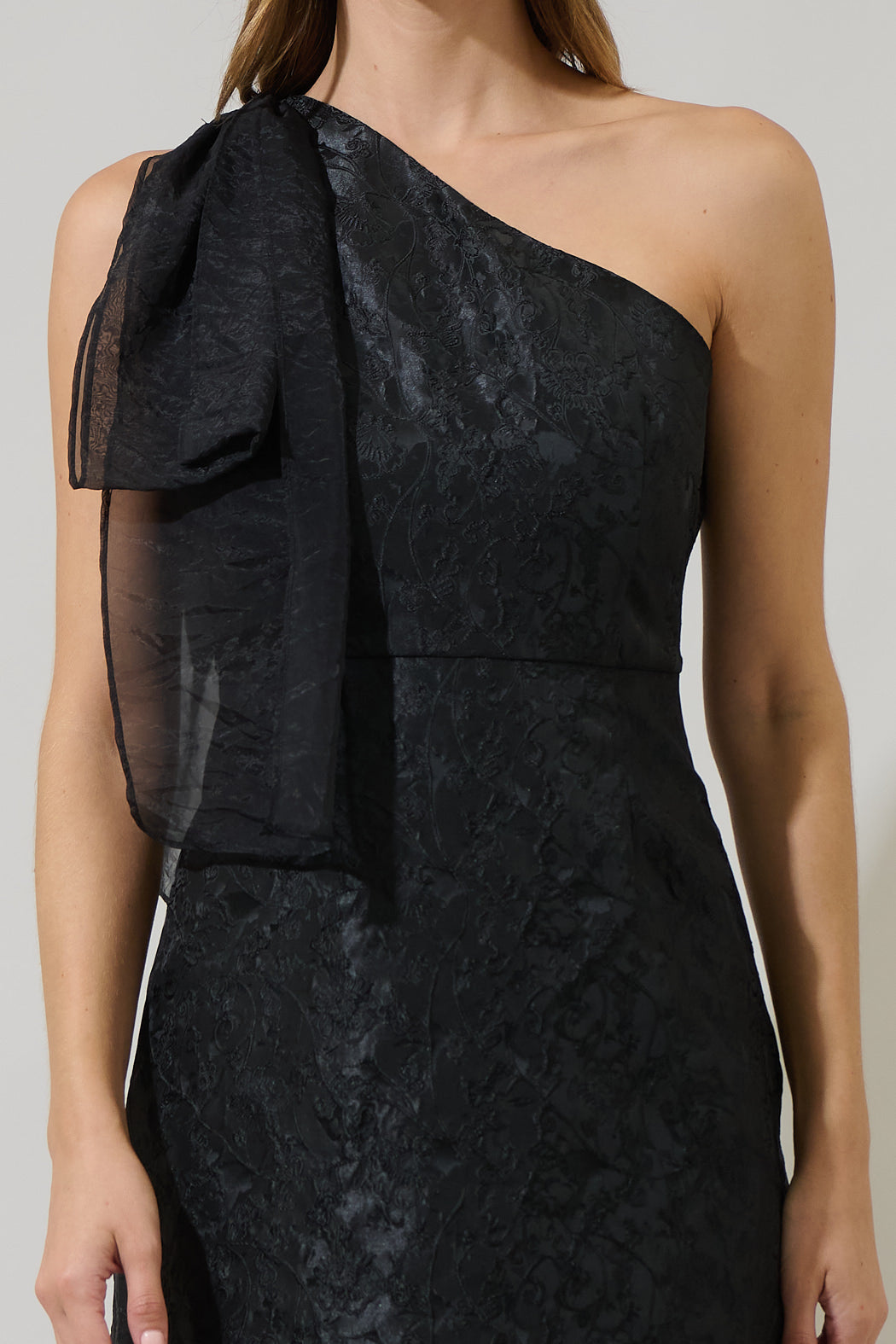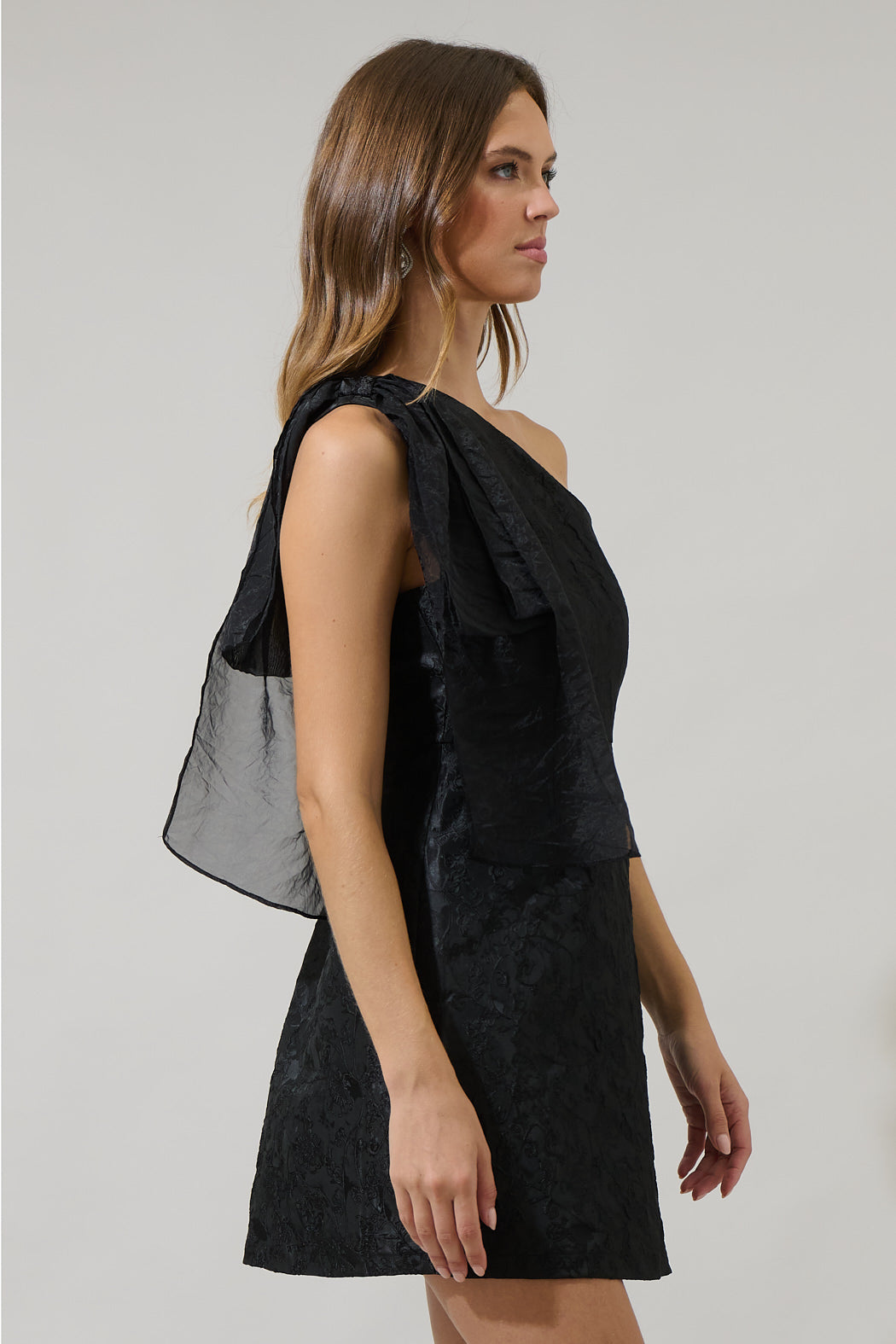 The Henefer Floral One Shoulder Mini Dress is the perfect thing for wedding season. It features a one shoulder sleeve with a sheer bow on top and a beautiful contrasting floral print throughout. Pair it with mules and a matching handbag.