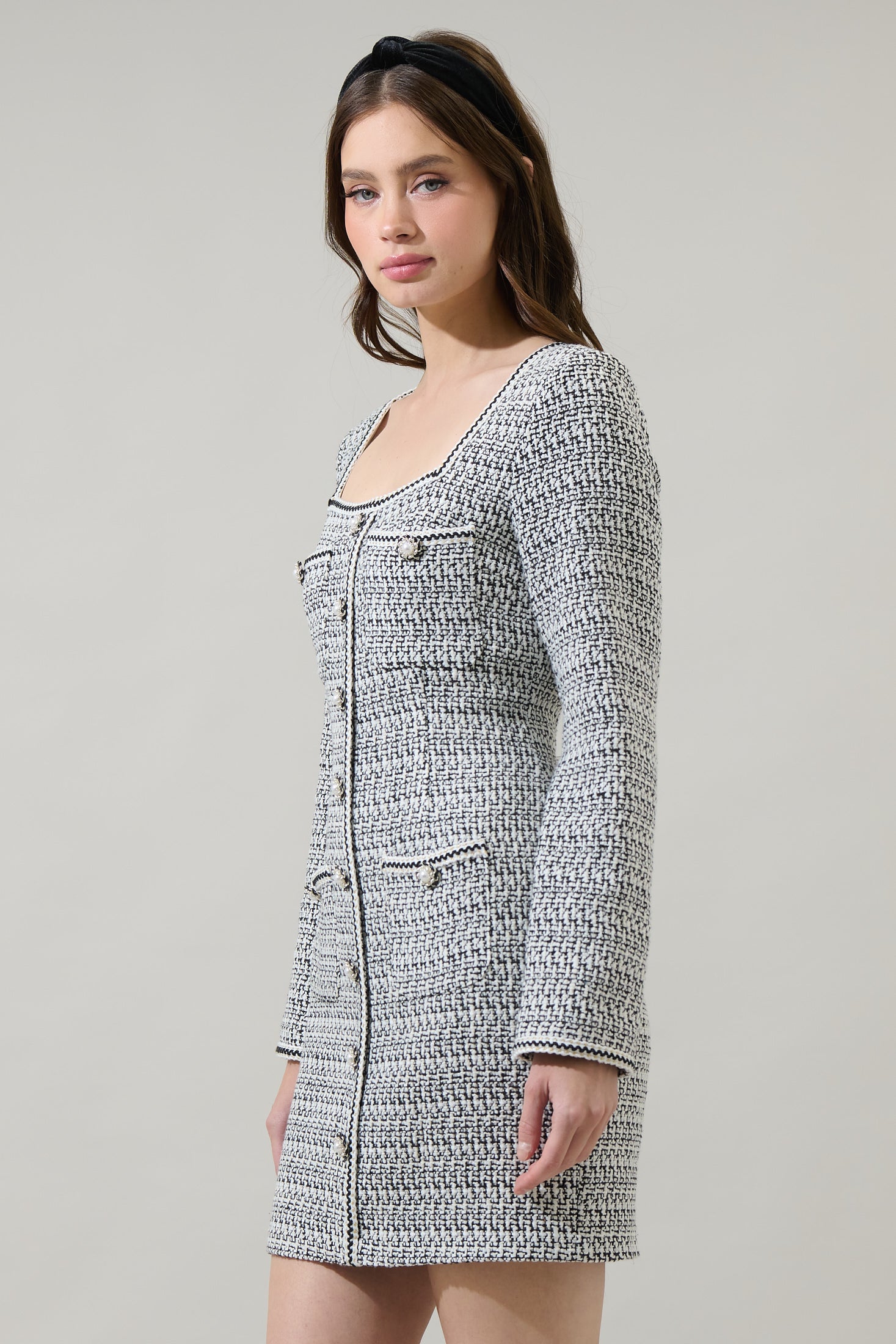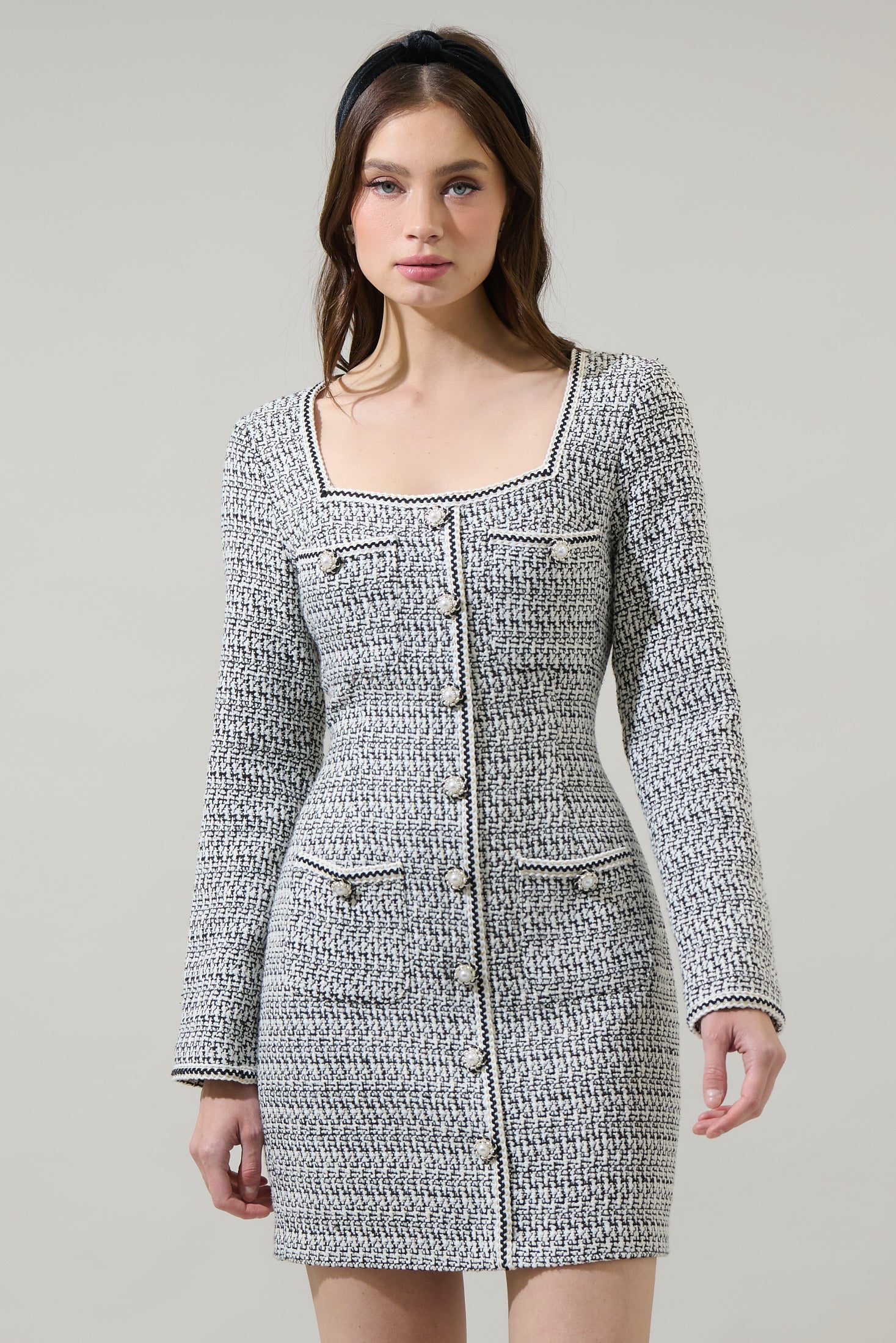 We love the combination of the Janae Tweed Salome Bow Button Down Mini Dress. A tweed plaid fabric shapes a square neckline, long sleeves, and a button-down front. The back has an invisible zipper. Add on mules or chunky heels to match.