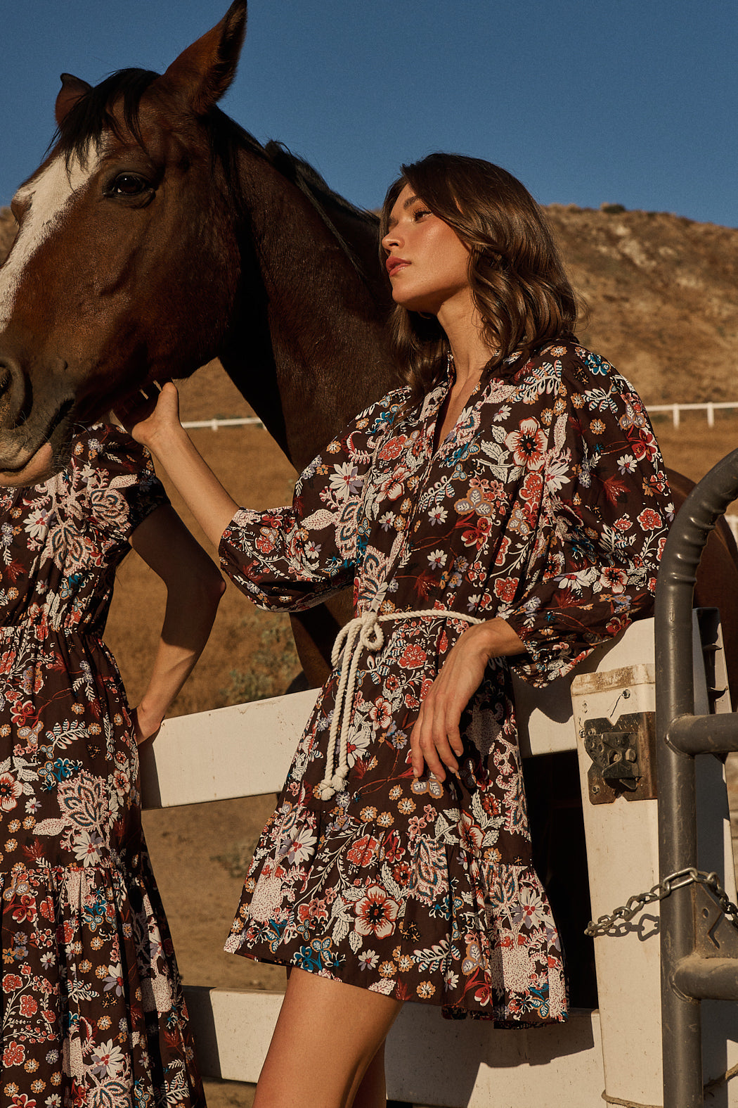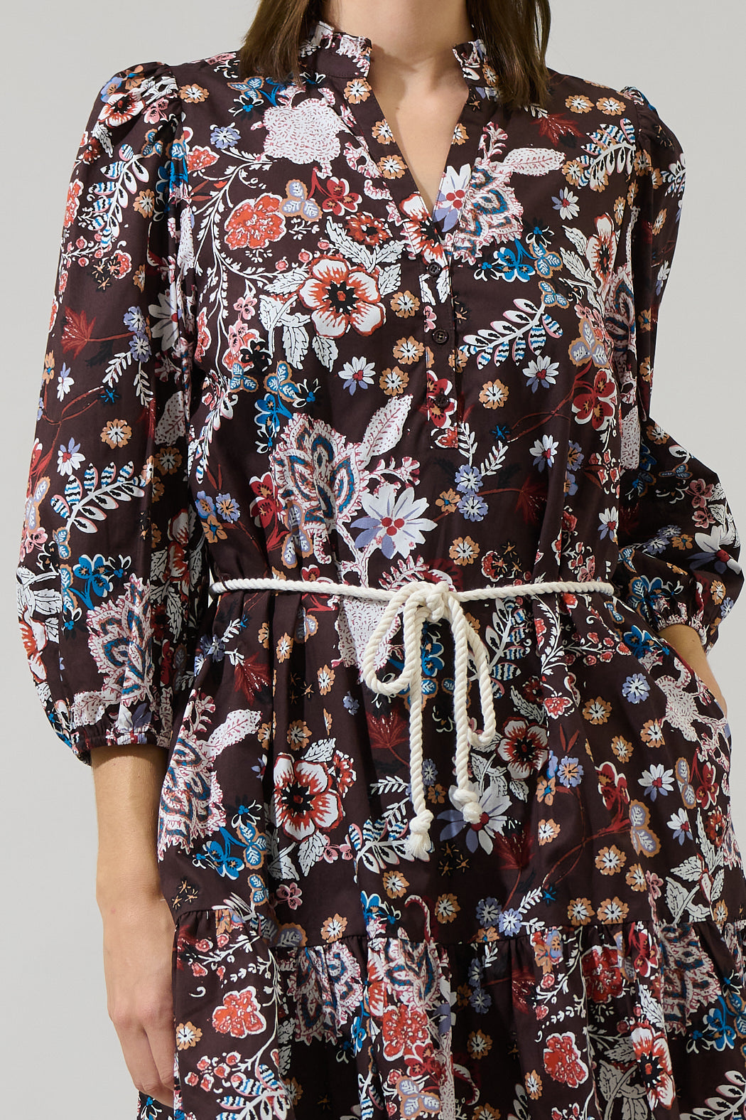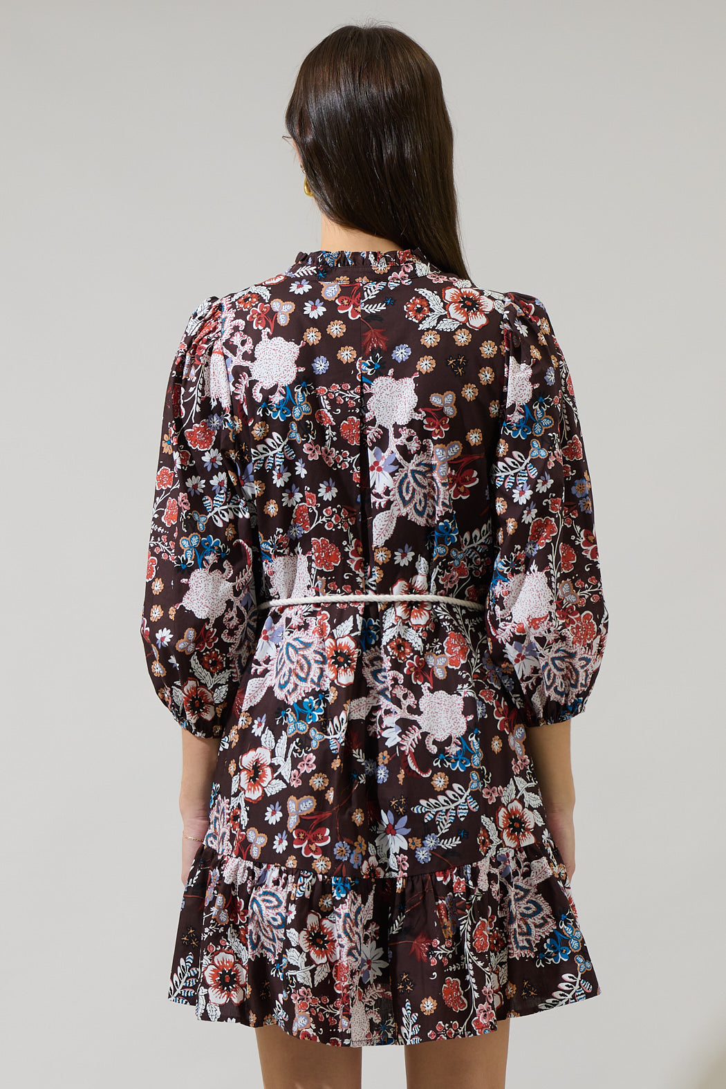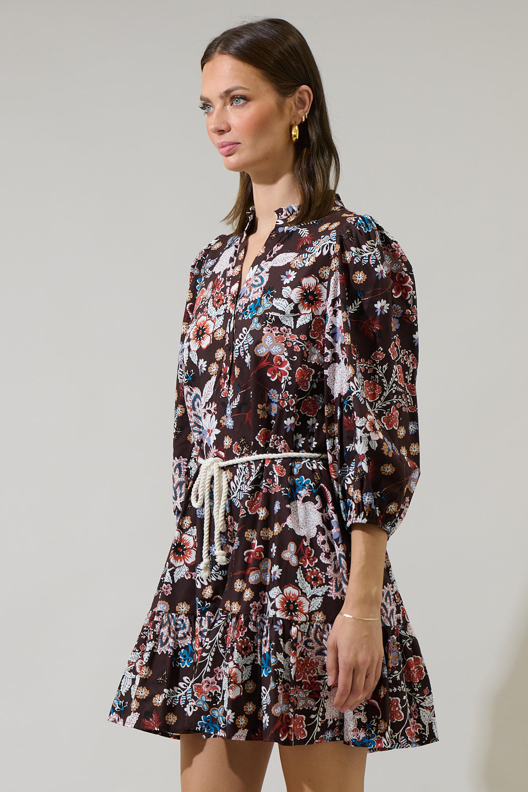 Introducing the Journee Floral Jazlyn Split Neck Mini Dress, with an outstanding floral print. It features long balloon sleeves, a ruffle neck, and a button front. It also has a belt rope around the waist and ends in a mini ruffle hem. Wear the dress with your favorite white heels and jewelry.