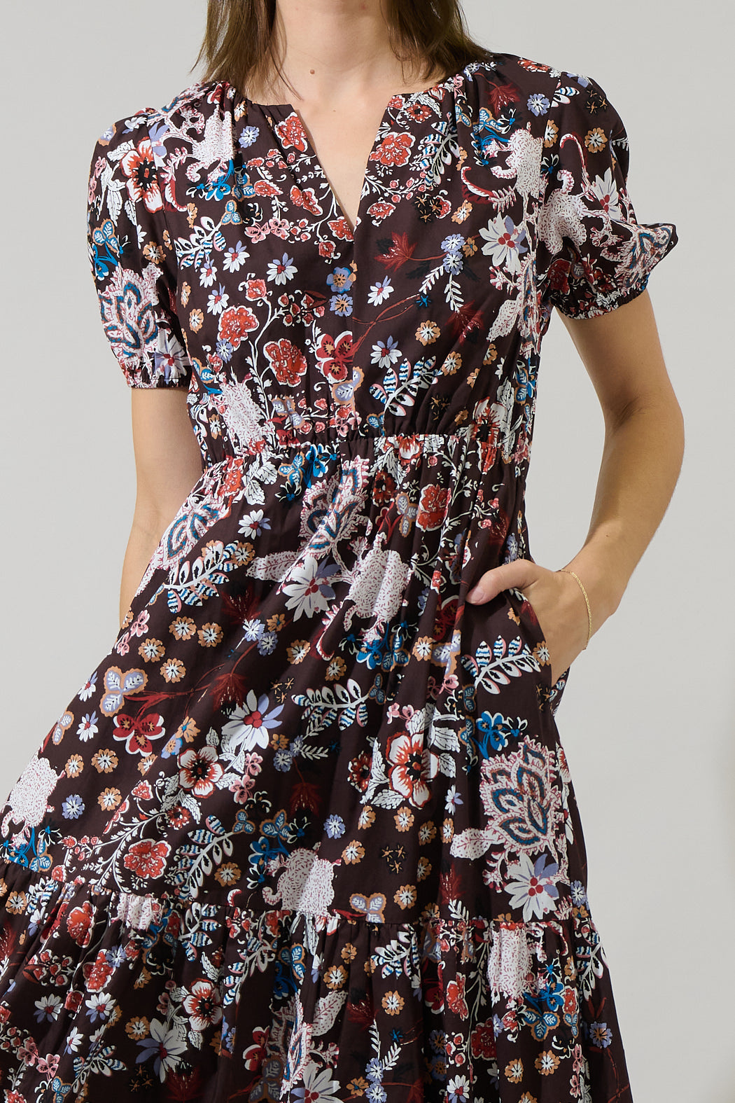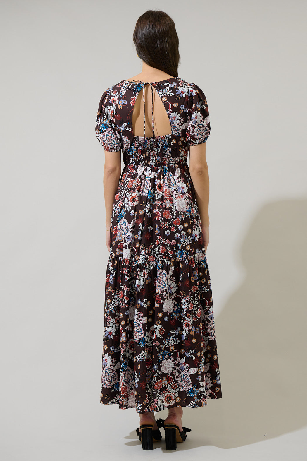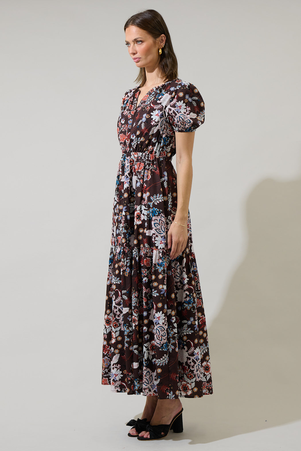 For a next-level look simply wear this lovely Journee Floral Morty Puff Sleeve Maxi Dress, with a brown background and multi white florals throughout. Short sleeves puff sleeves frame a split neckline, and a stretchy, thin waistband. The full maxi length is perfect to wear with short heels.
