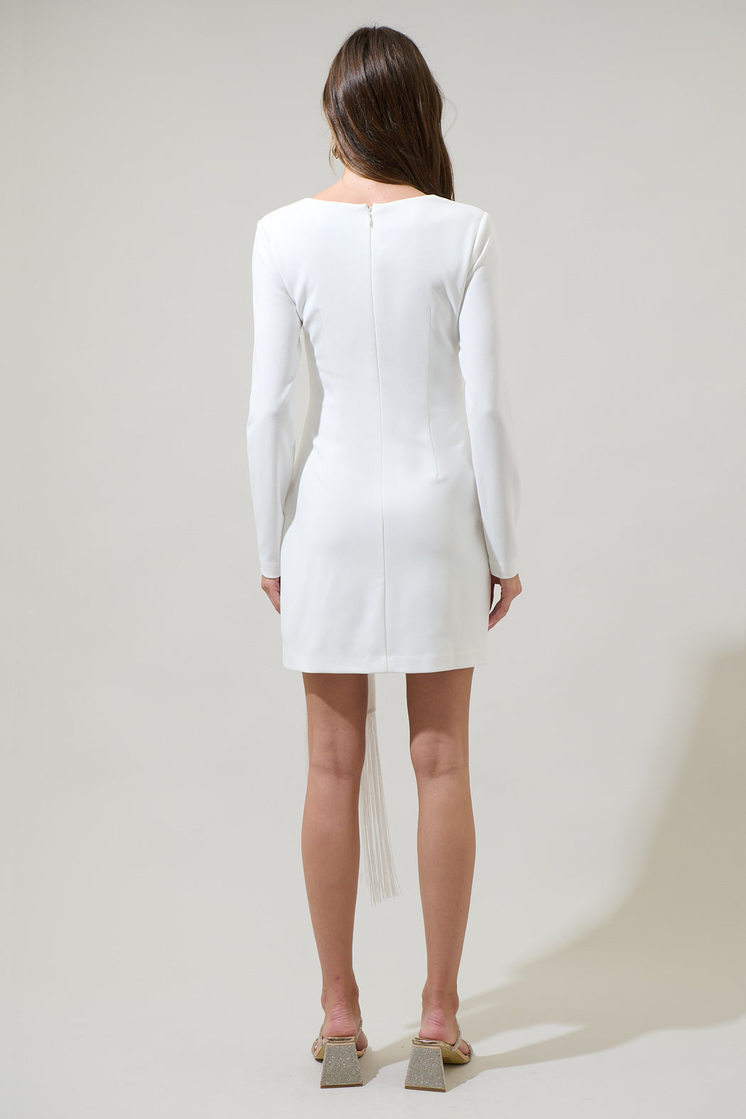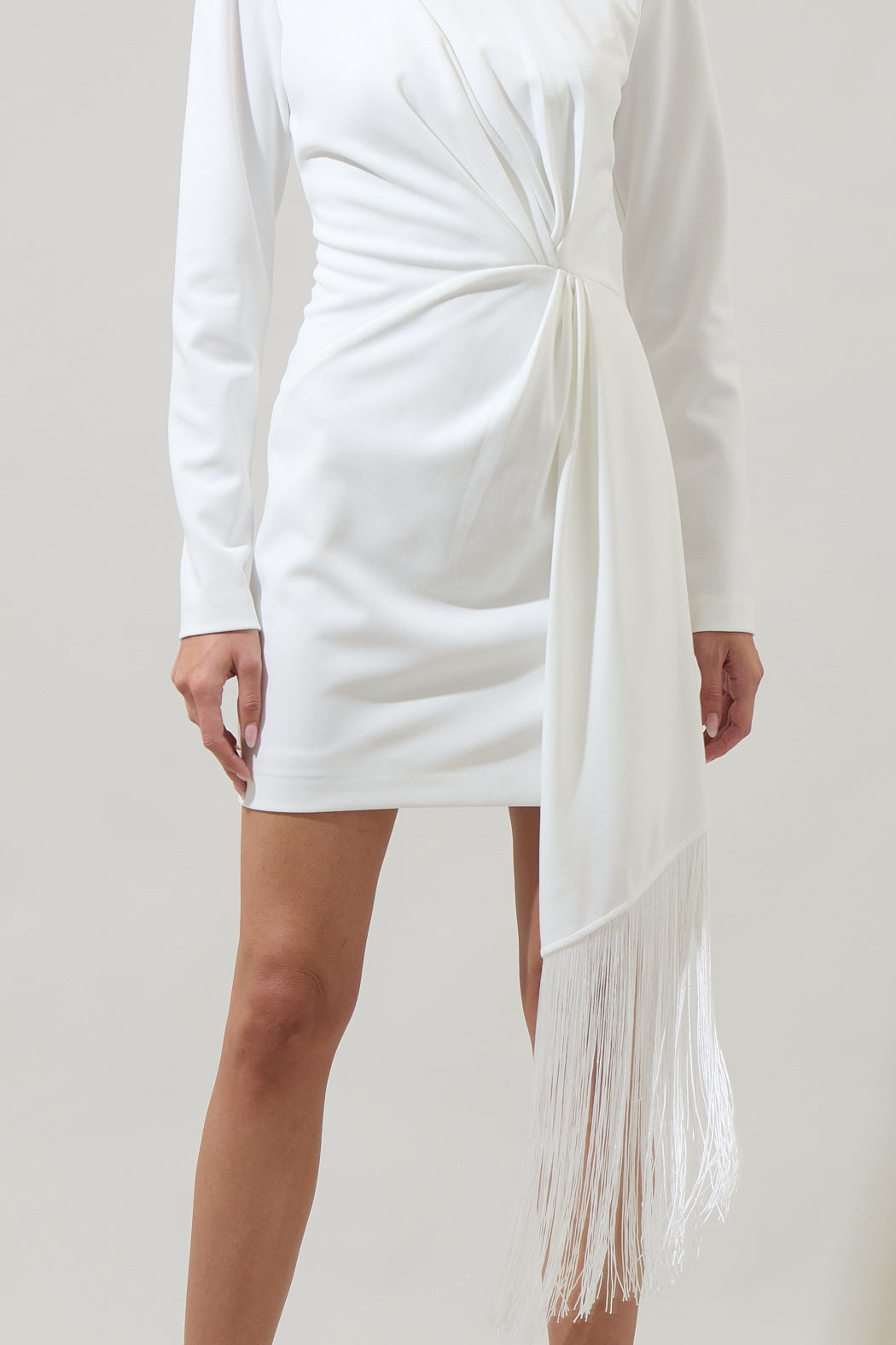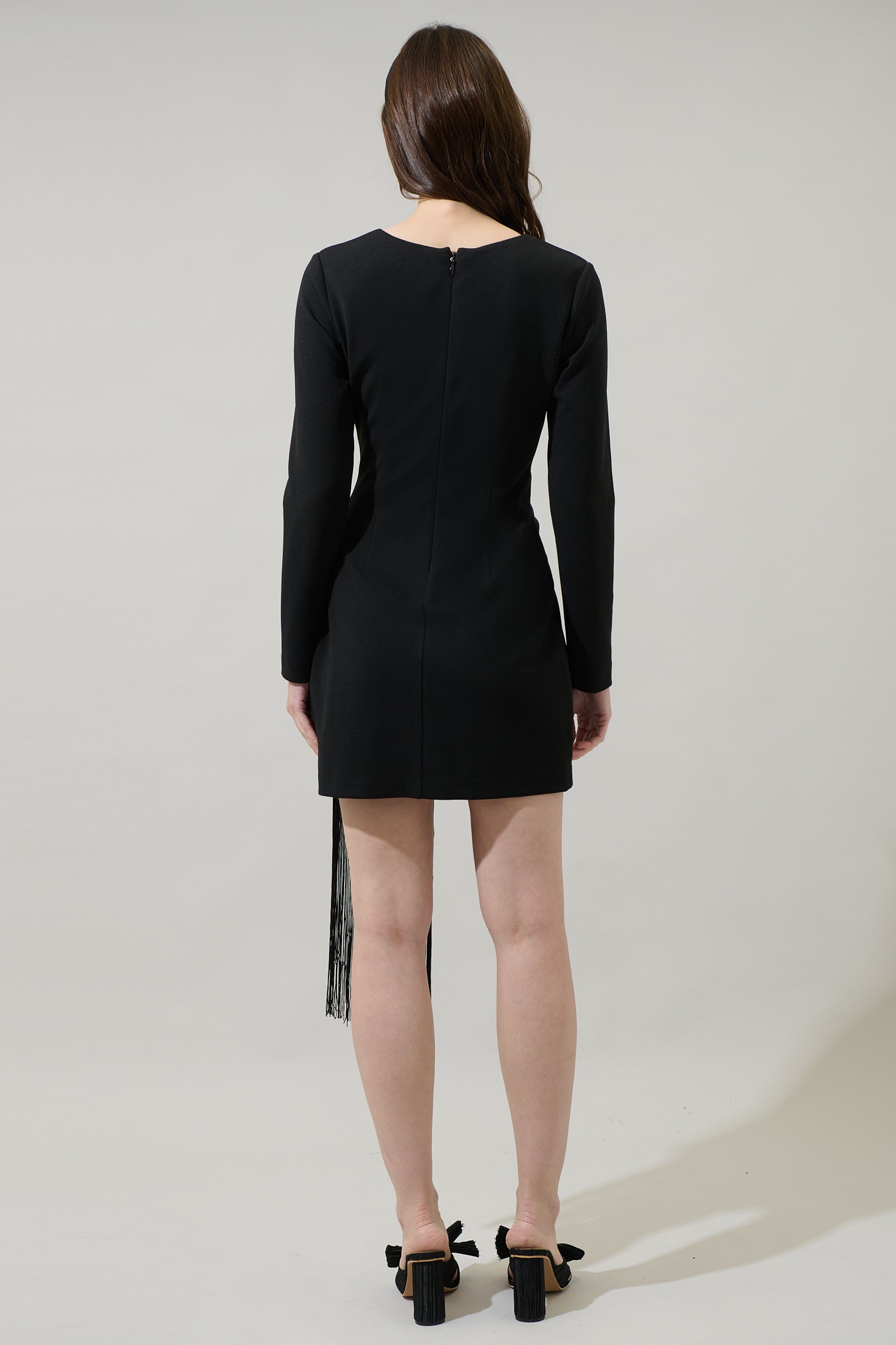 Show up fashionably late in this gorgeous dress. Long sleeves shape this must-have dress that has a round neckline and a lightly gathered pleated bodice with fringe trim. A fitted waist tops a draping mini skirt that creates a stunning silhouette.
