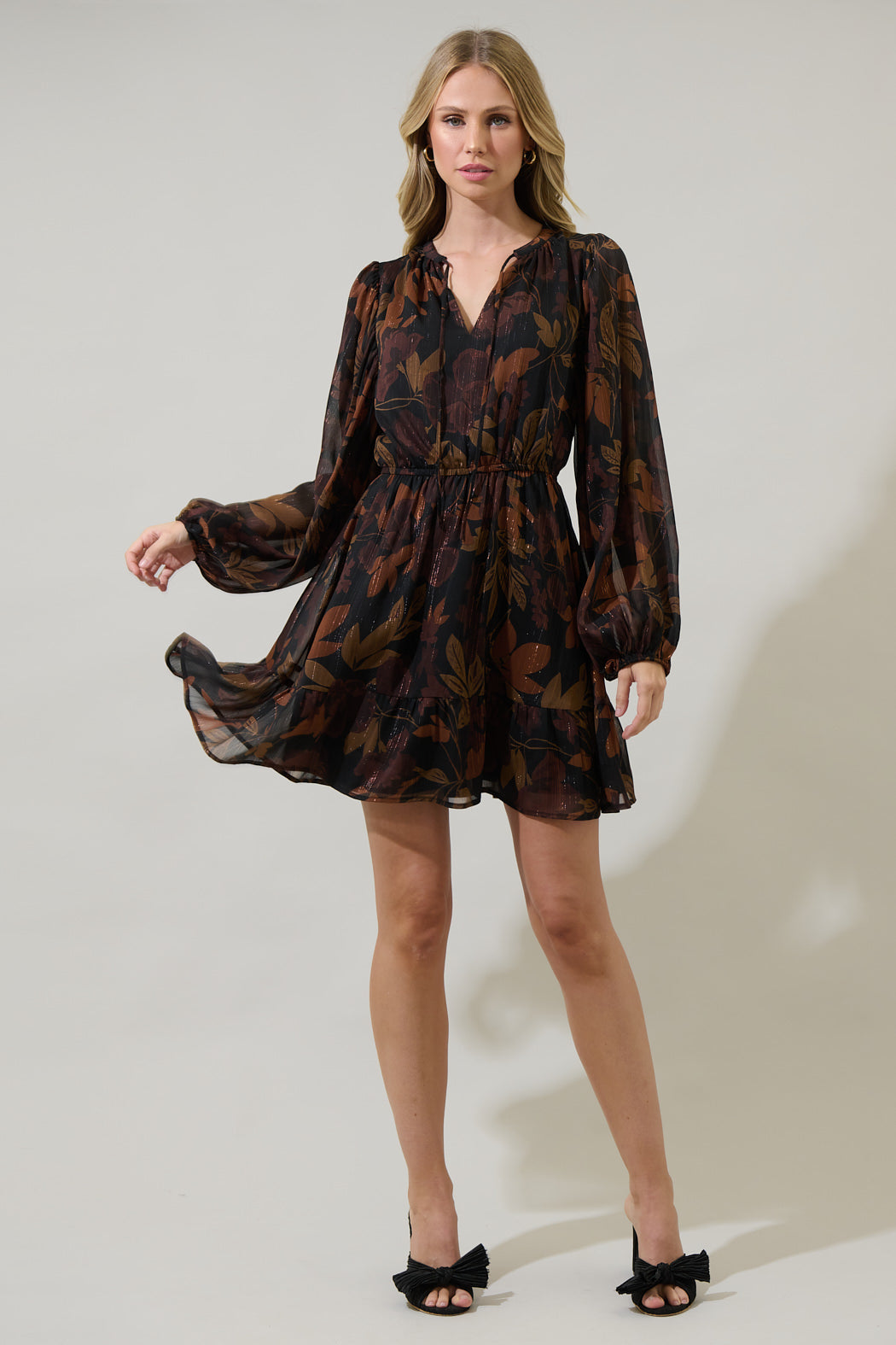 You'll be looking beyond gorgeous in the Larba Floral Paxton Balloon Sleeve Mini Dress. It features a split neckline with a tie detail that's framed by sheer, long balloon sleeves. An elastic band at the waist creates shape, topping a gathered flowy single tier skirt. Pair it with strappy heels and a black matching bag.