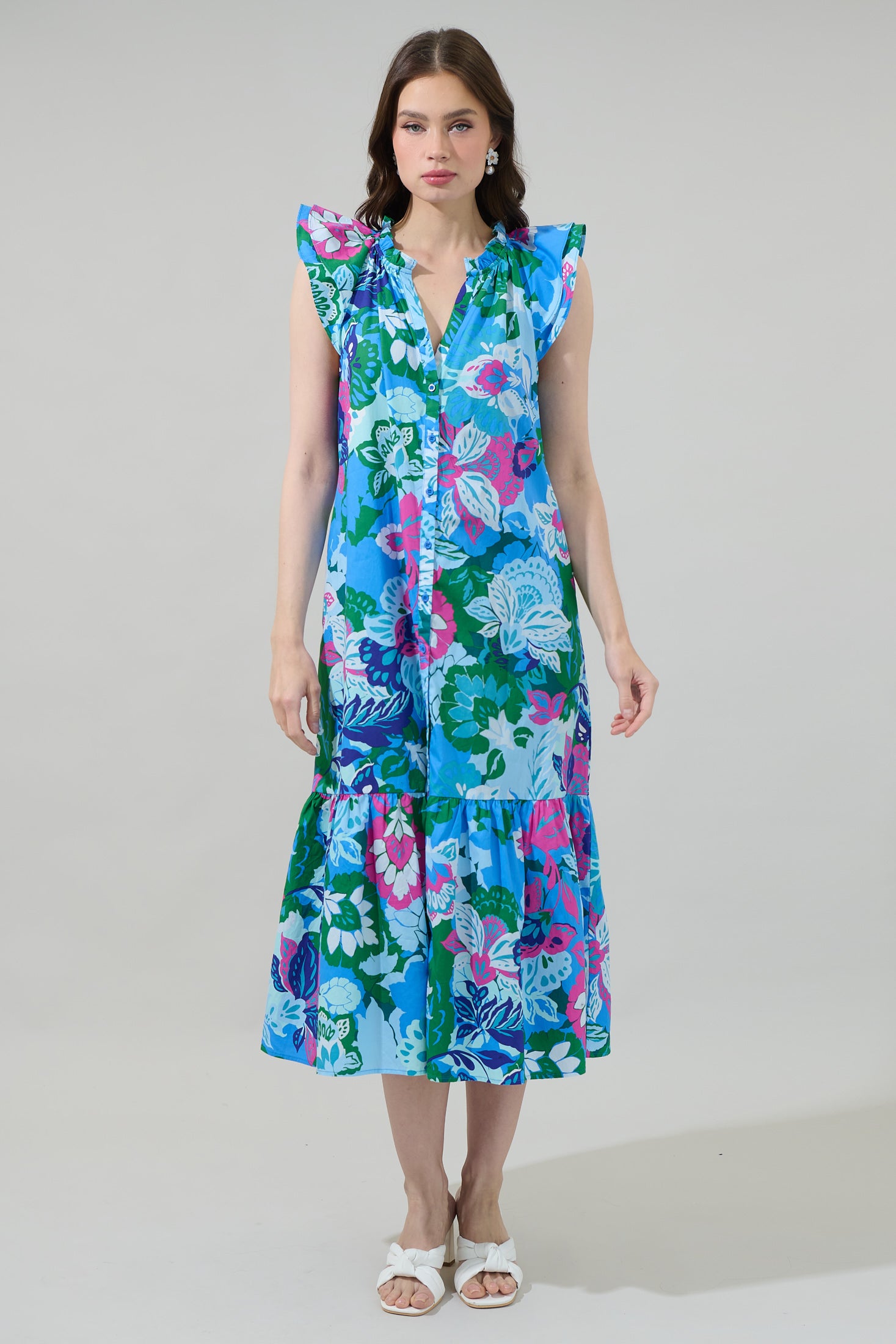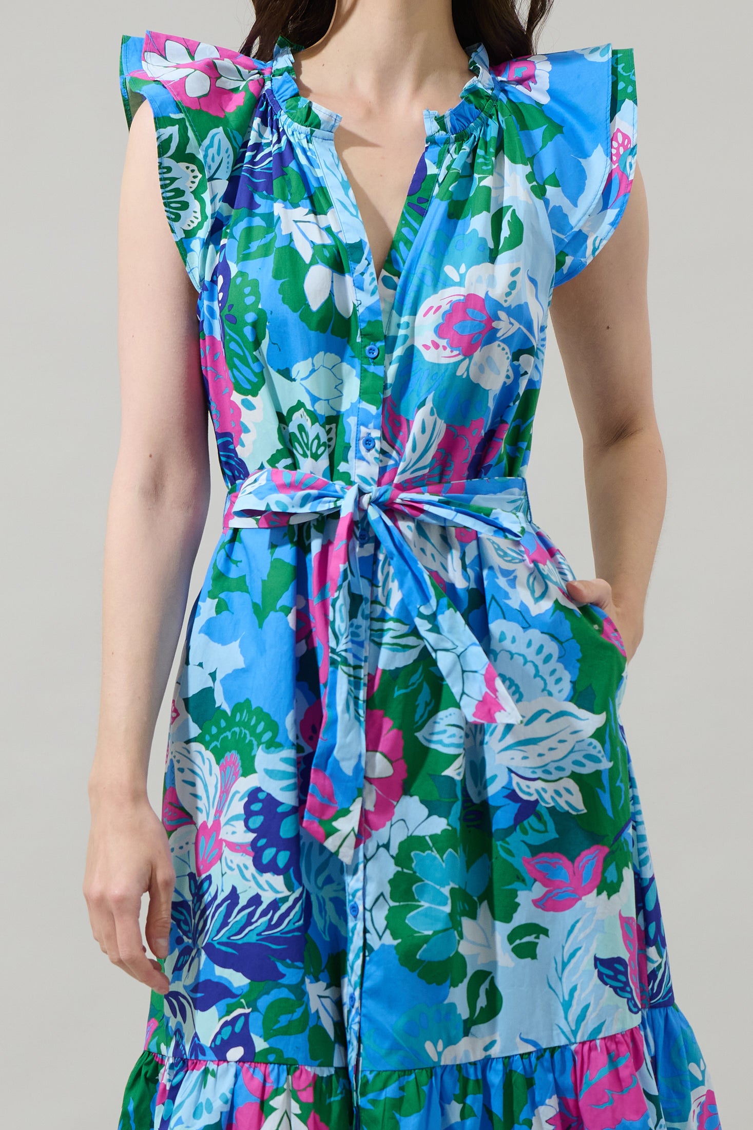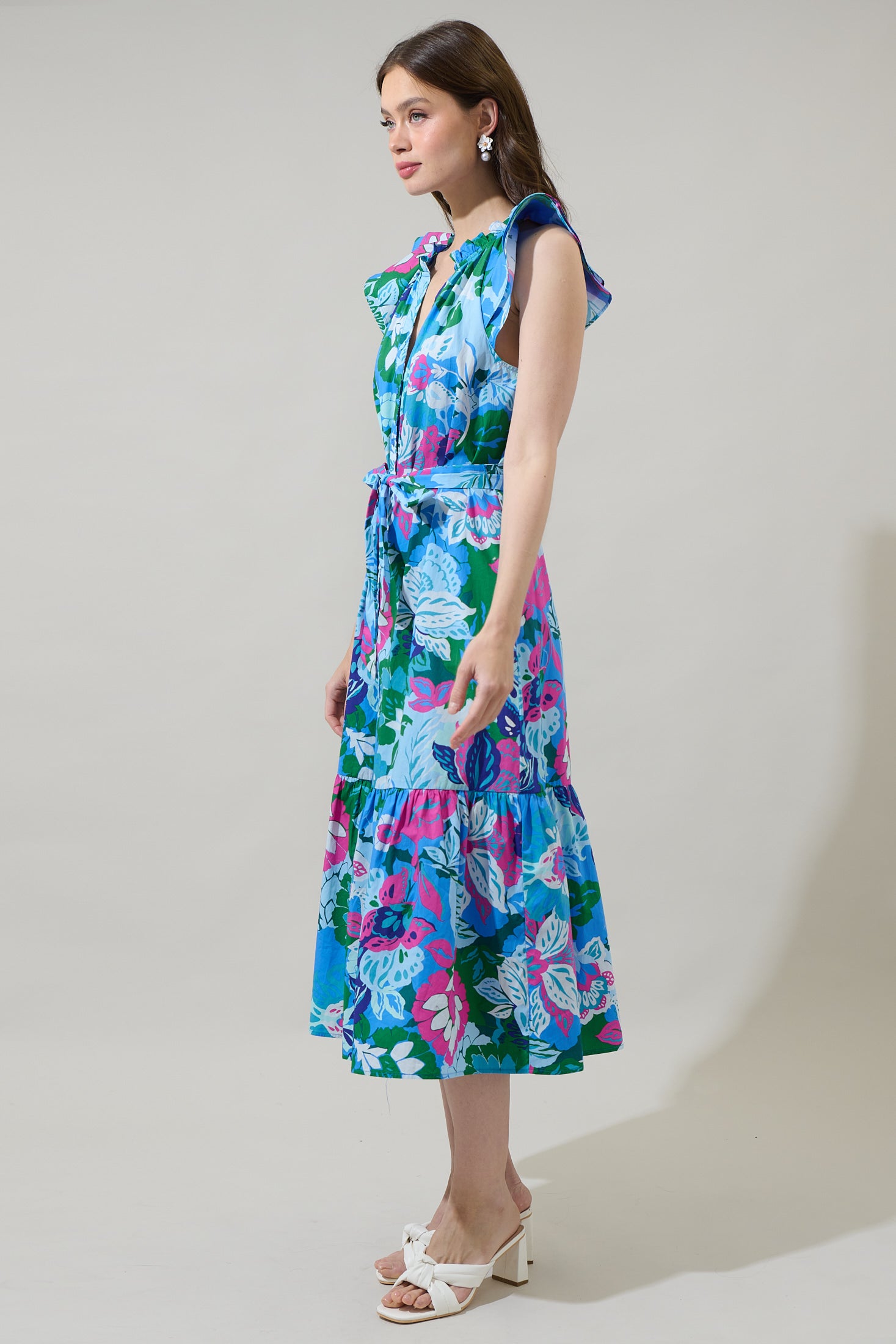 Get ready to be admired for looking good in the Lavera Floral Charlotte Button Midi Dress. It features a split neckline and a flare bodice, framed by short cap sleeves. A belt wrap around the waist and secure at the back, followed by a button-down design. Pair it up with sandals and a summer hat.