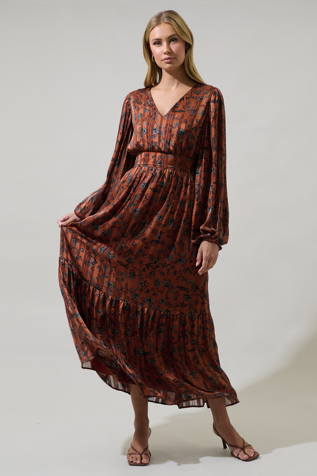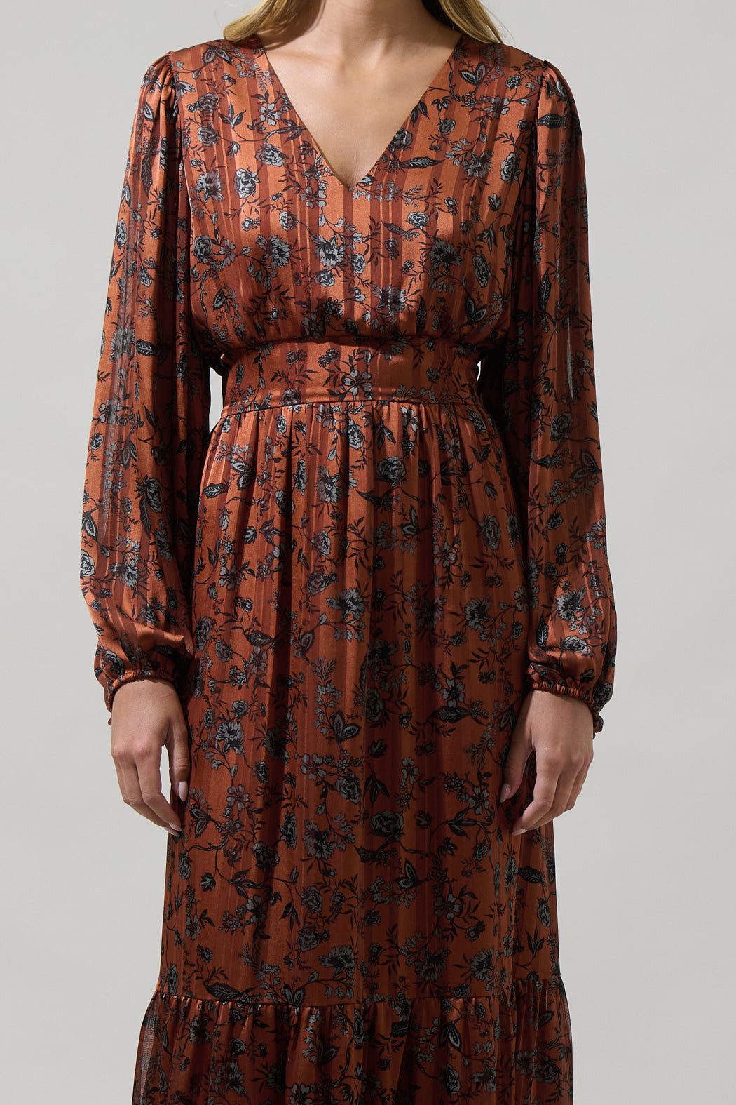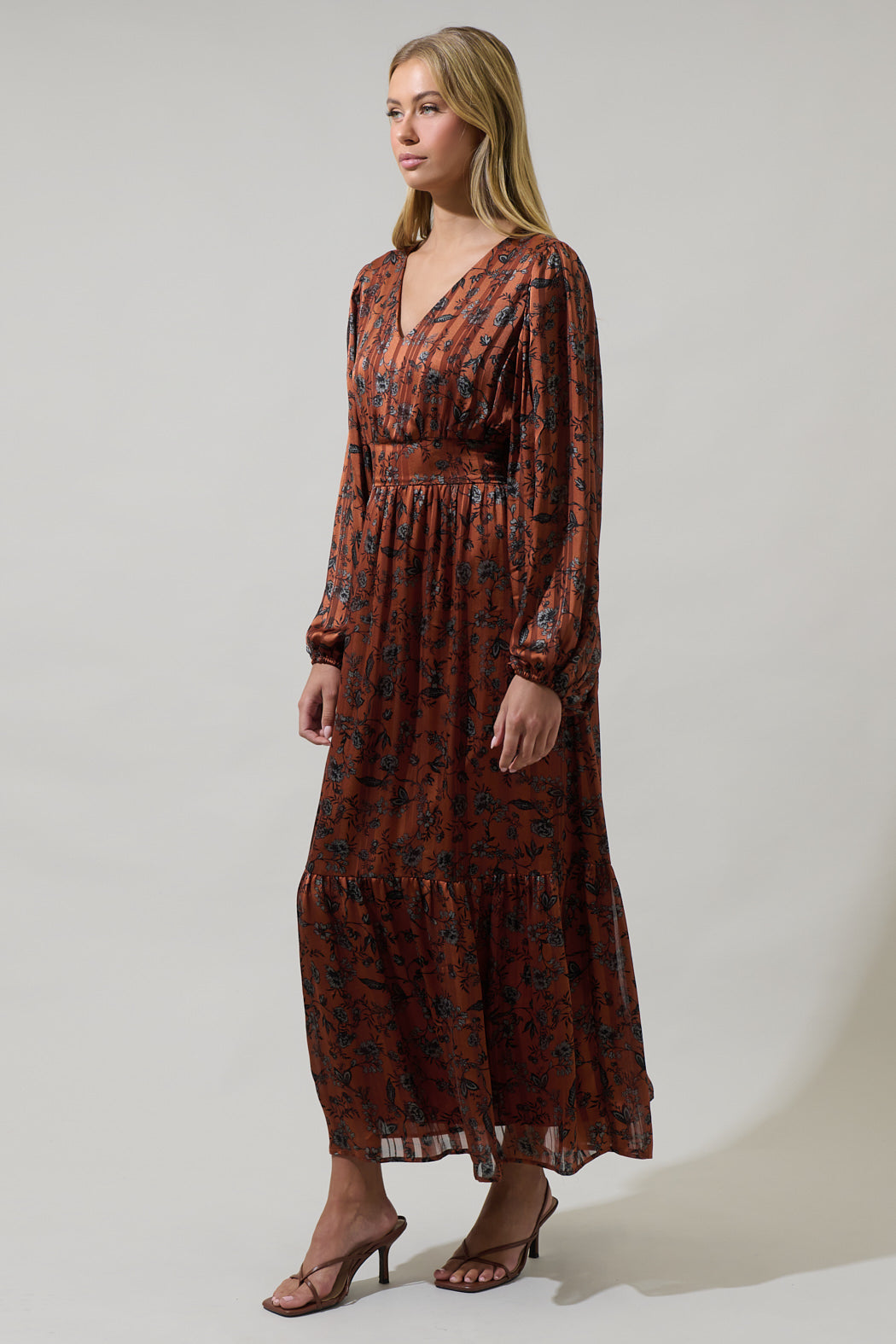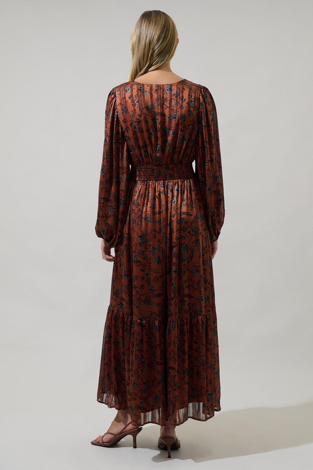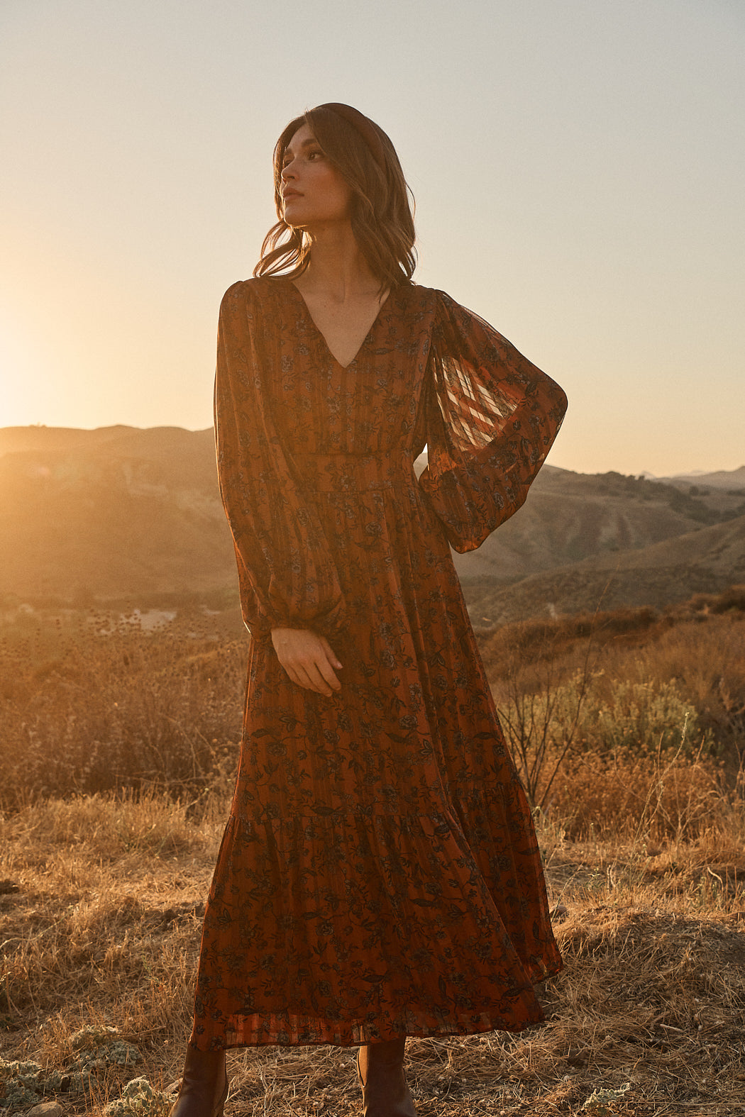 A pretty sunset and you in the Leoben Floral Kent Long Sleeve Maxi Dress, will be stunning. A lovely brown and black floral print shape this long sleeve dress with a v neckline. A back smocked waist enchants this maxi dress. You can pair it up with black boots or heels to complete the look.