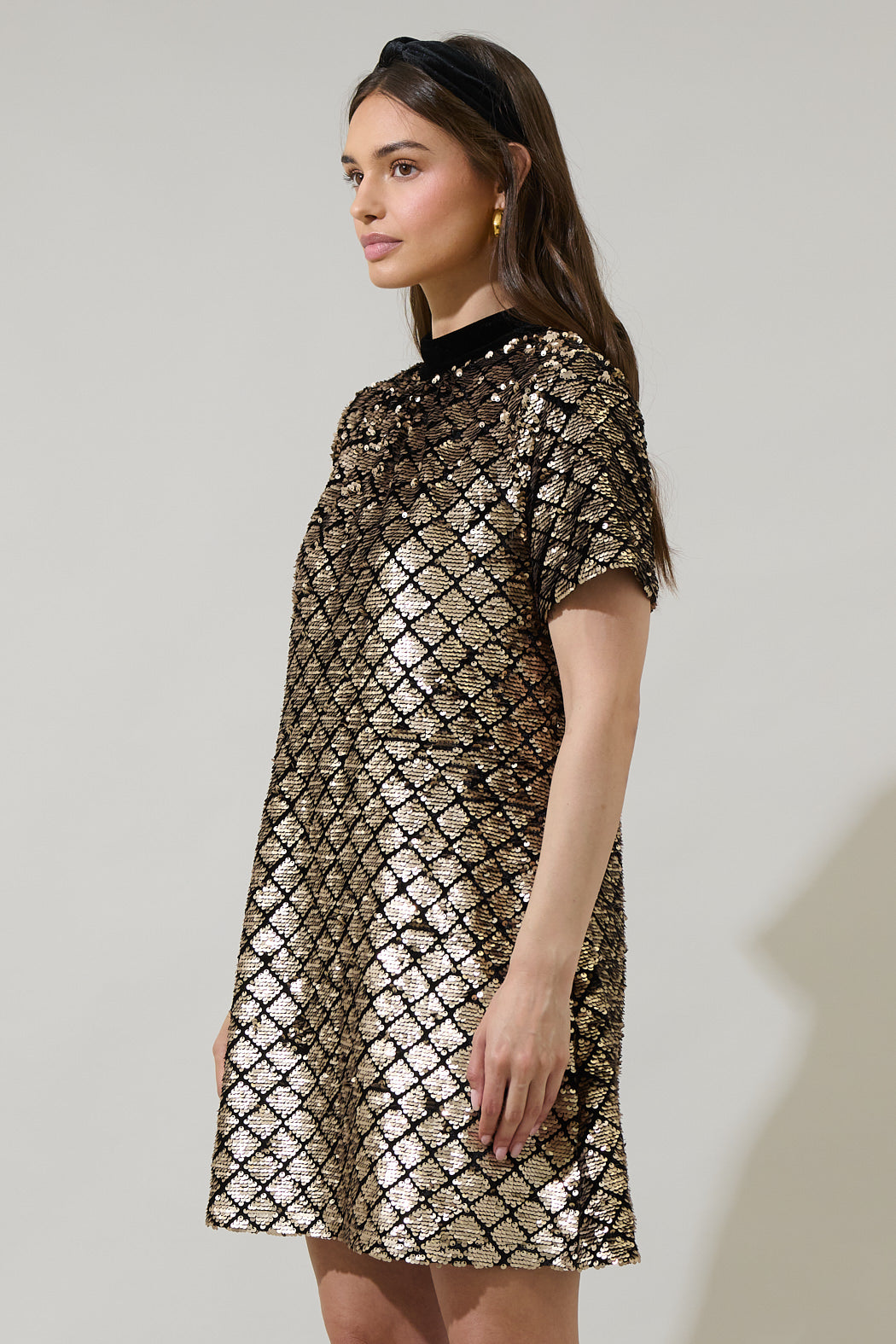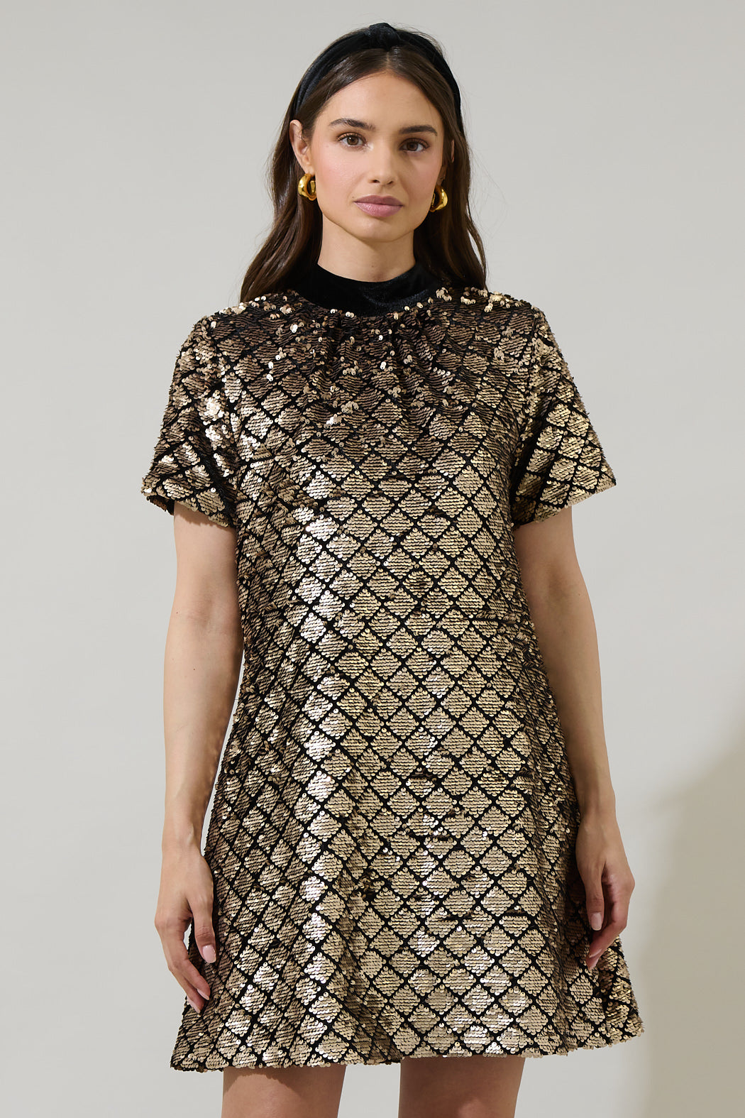 Found some last-minute weekend plans and need an unreal 'fit? Then we have you covered with the Leslie Sequin Nova Back Bow Tie Mini Dress. A deep bow tie back with an A-line silhouette shift enhances a perfect fit. It has a high collared neck with short sleeves around to compliment the dress. Pair it with strappy heels and soft waves for a dreamy ensemble.