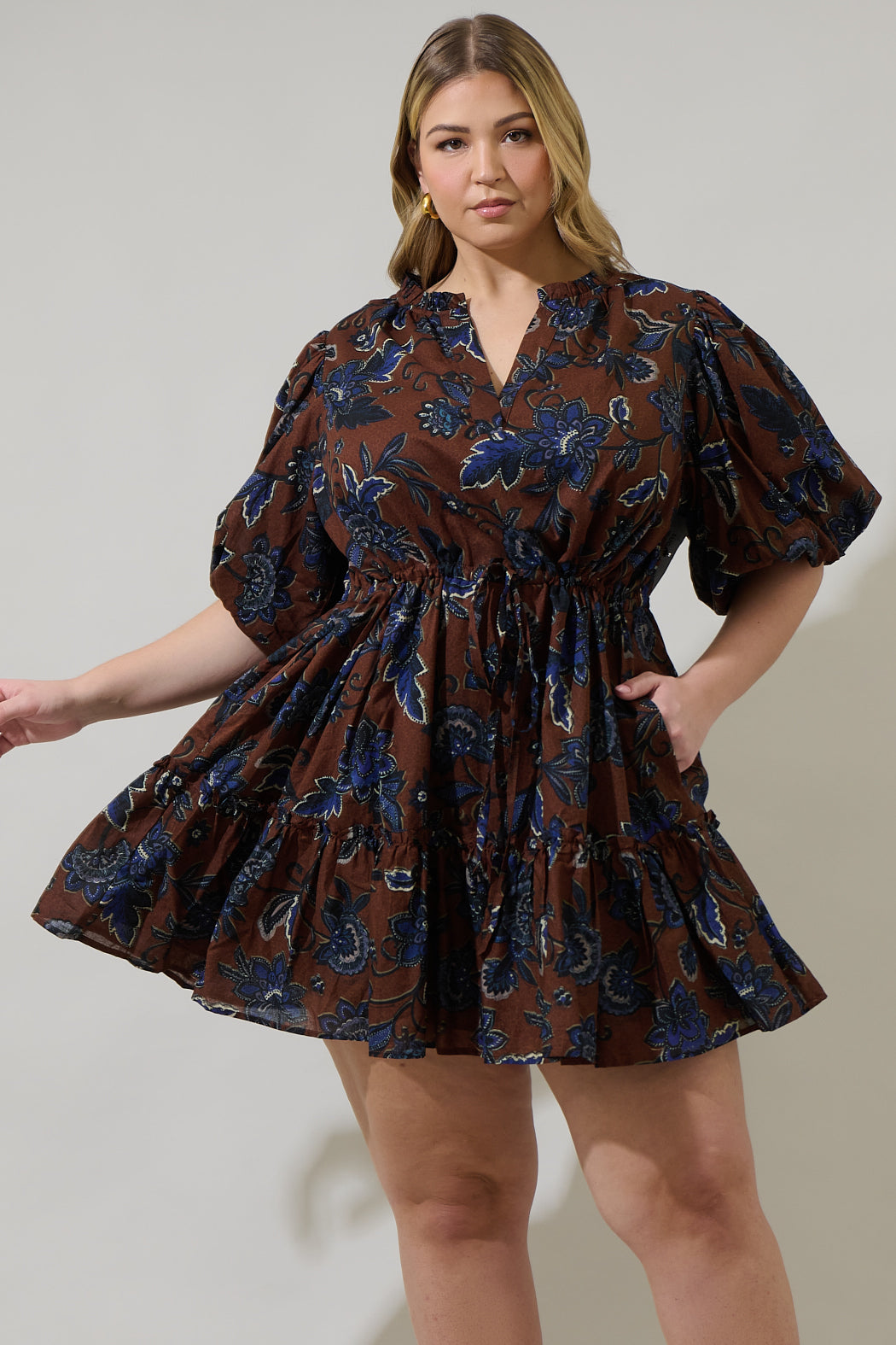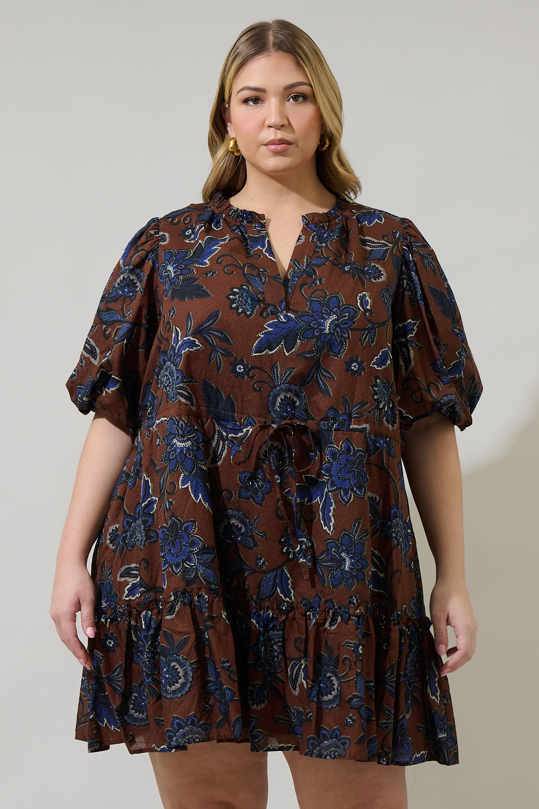 You sure will look lovely in the Marlina Floral Noella Shift Mini Dress. It features short puff sleeves framed by a split neckline with ruffles around the edge. Keep it as shift style or use the string tie to adjust around your waist. Combine it with heels or boots for a cute look.