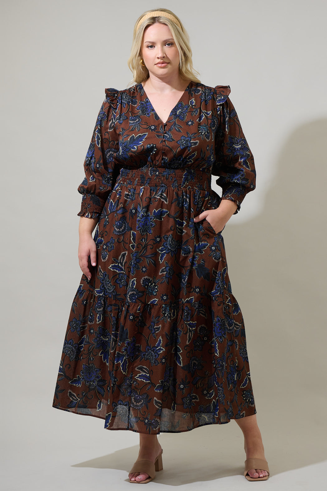 The Marlina Floral Norma Long Sleeve Midi Dress will help you be ready in no time. A lovely brown and blue floral print create long sleeves with ruffles at the shoulders and smocked cuffs. It has a button up v-neckline that leads to a smocked waistband. Pockets on each side make it very convenient. Pair the look with brown heels to match.