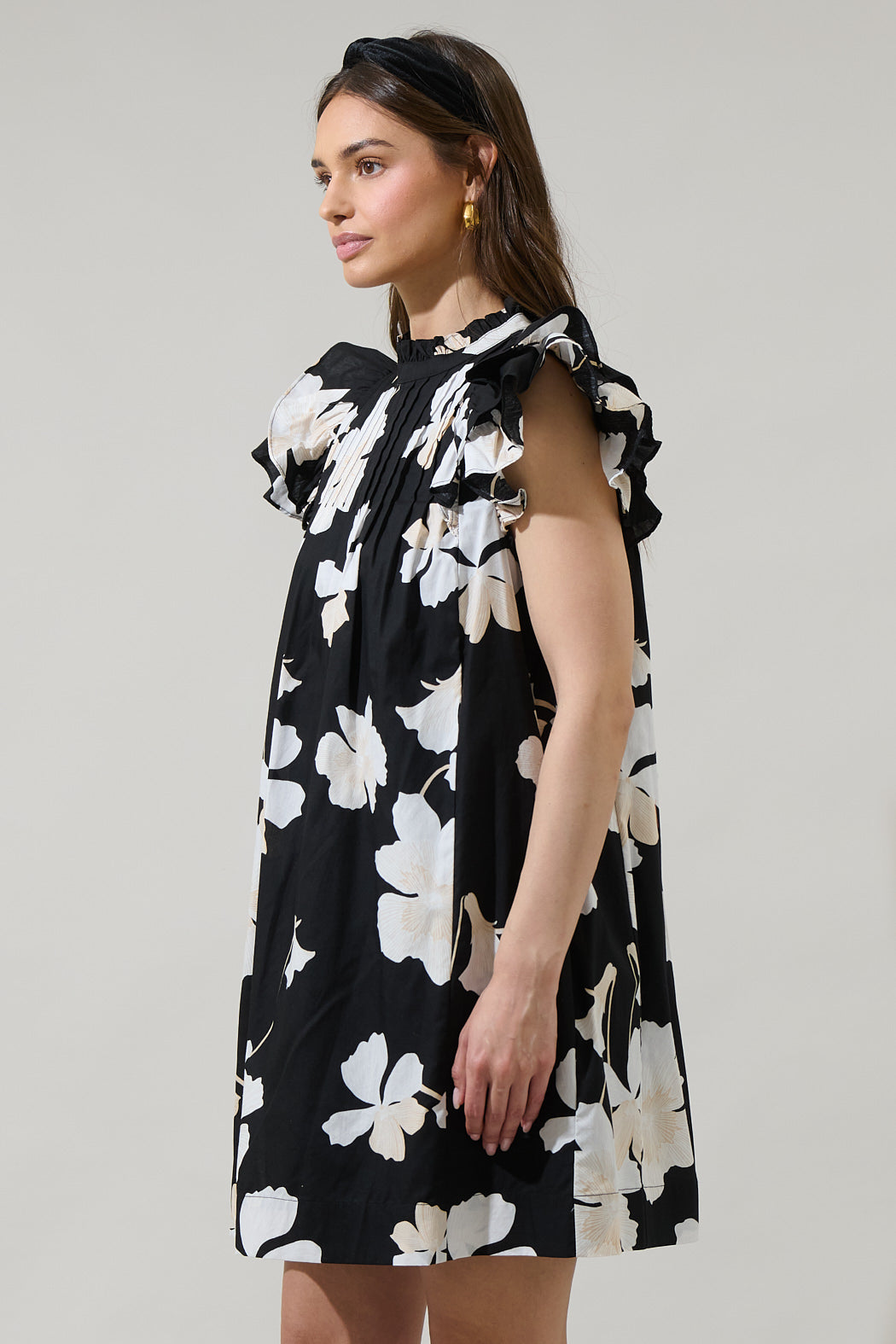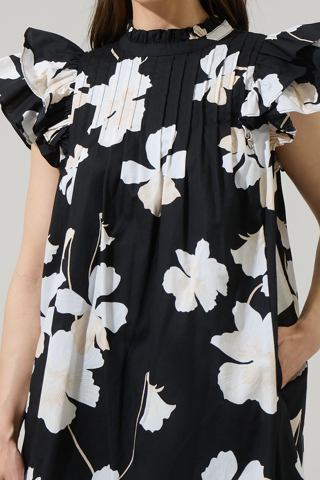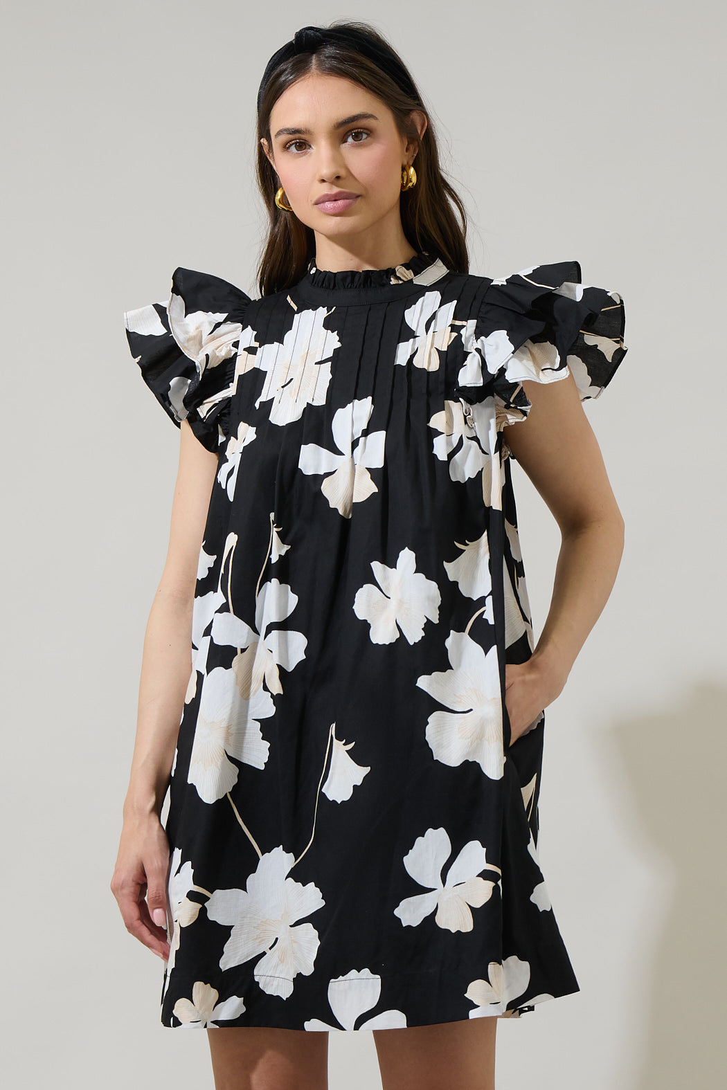 The Medina Floral Lovel Shift Mini Dress is one of those dresses we're always reaching for. Short layered ruffle cap sleeves frame this mock neck, pleated front mini dress. The back also had pleats on the top and a keyhole. Pair the look with white earrings and black heels.