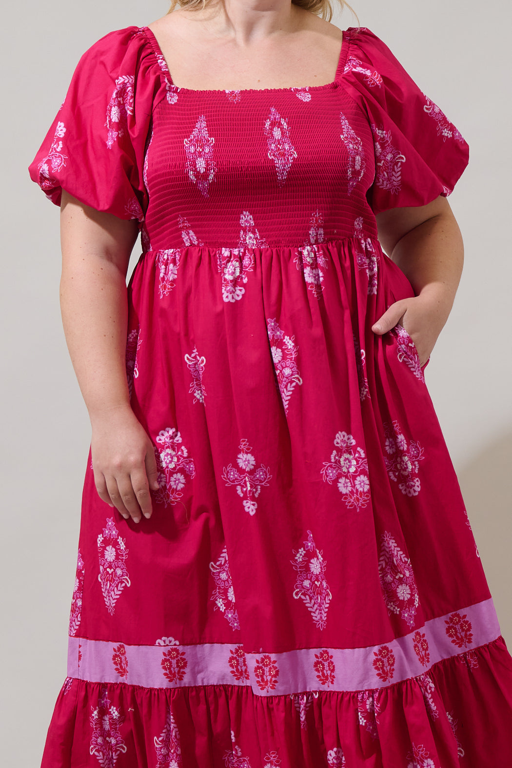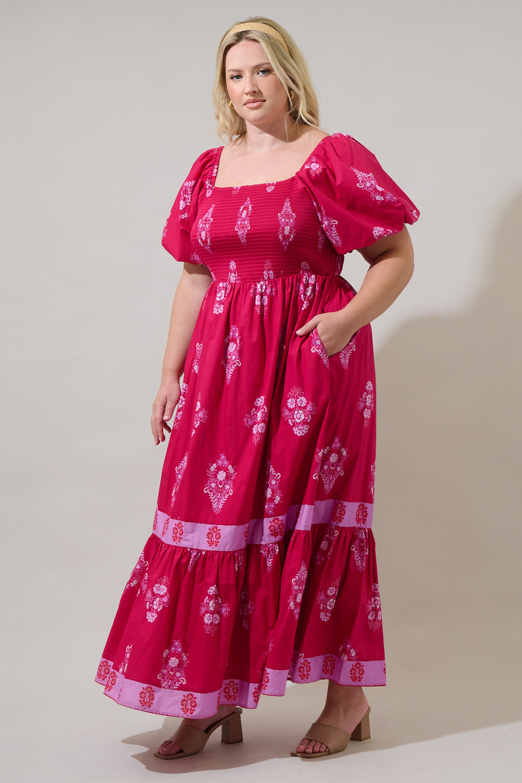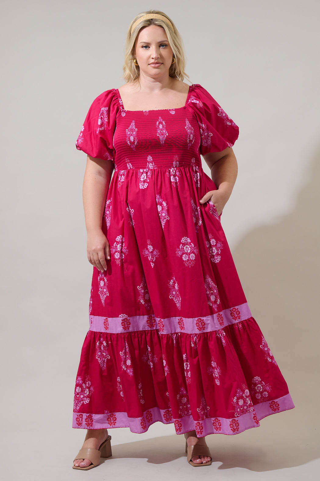 Pretty in pink! The Mercer Floral Berky Smocked Maxi Dress gives us two tones of pink. It features short bubble sleeves, a square neckline, and with a front and back smocked bodice. It has a loose fit with a tier in the bottom. Keep the look fun with pops of colored accessories and shoes.