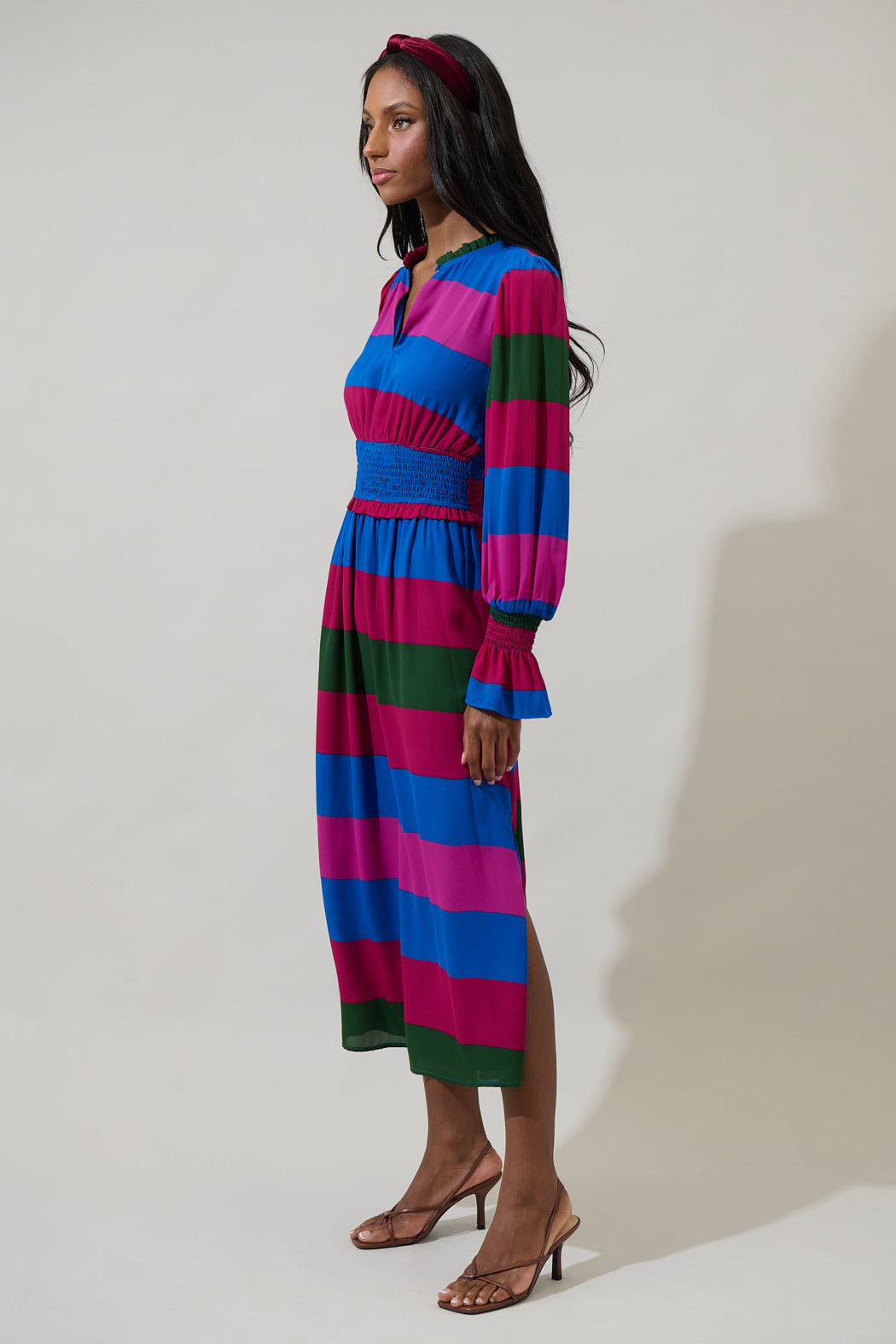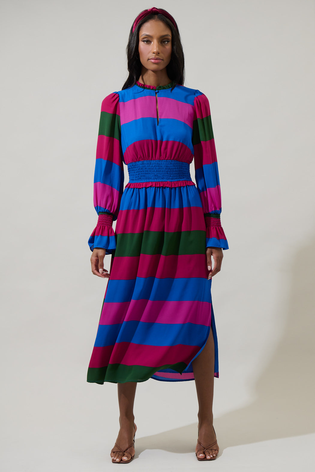 When the occasion calls for a little extra glam, slip into the Saige Striped Ria Smocked Maxi Dress. This colorful stripped pattern shapes long sleeves with smocked cuffs, and a split neckline with a button on top. The waist is smocked and the bottom is loose. Pair it up with pink heels to complete a chic look.