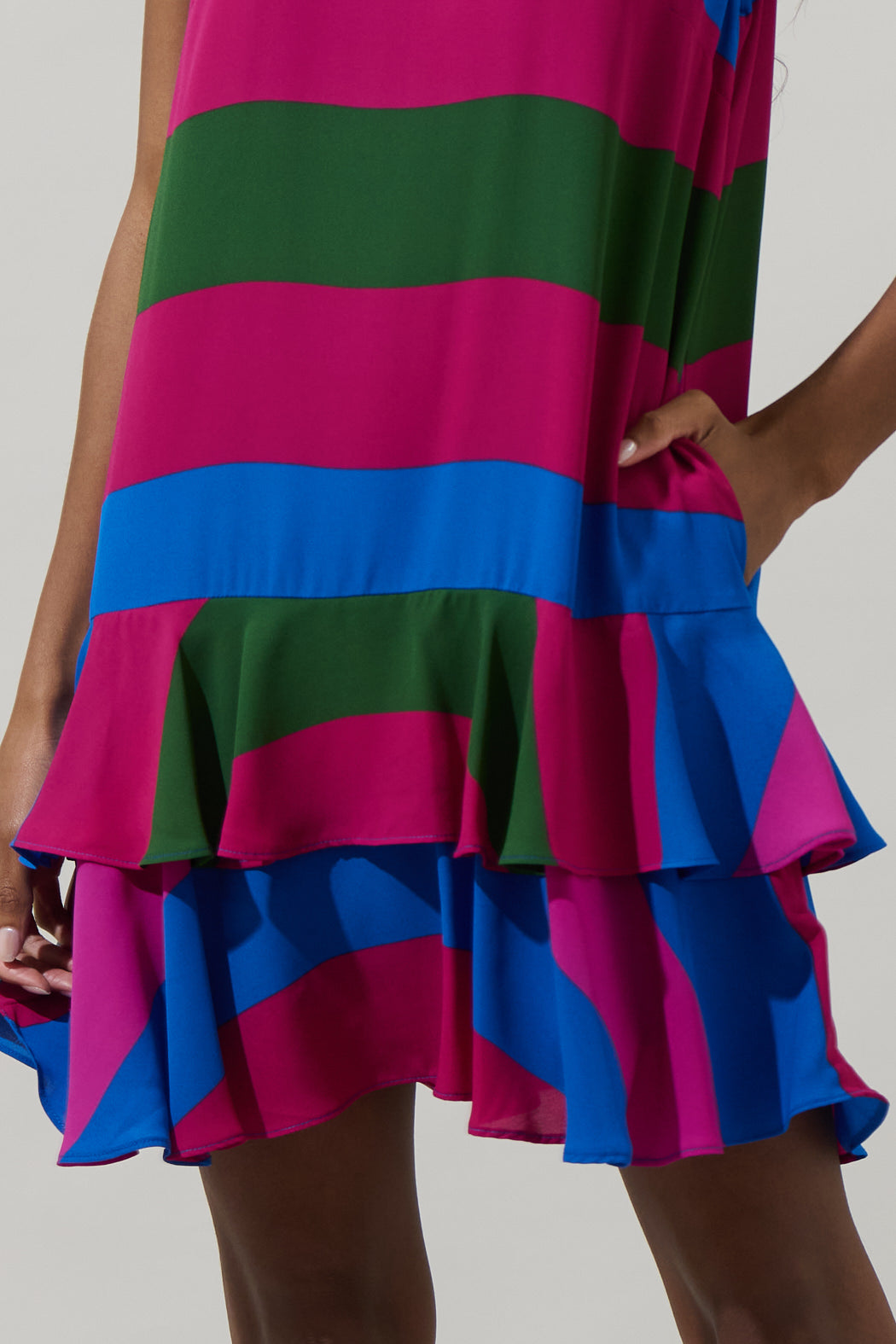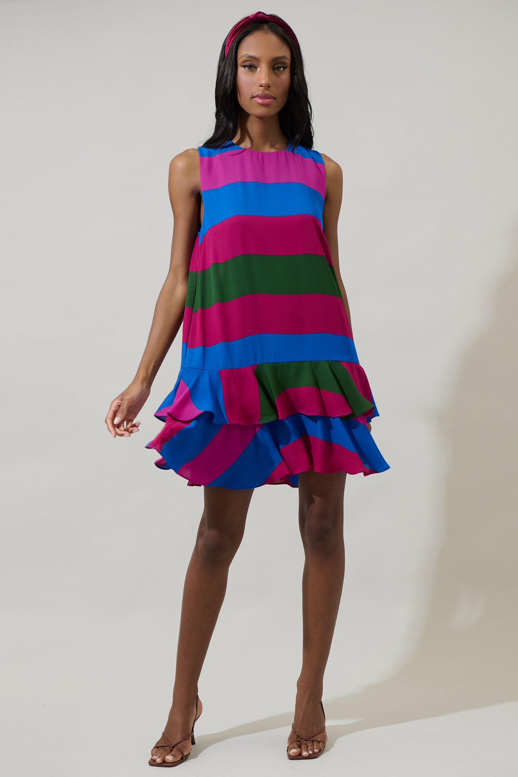 The Saige Striped Una Shift Mini Dress will make you feel like you have your own personal fashion show. It features a shift style with no sleeves, and ruffle tiers in the bottom. The back has a keyhole. Pair it with heels and fun accessories.