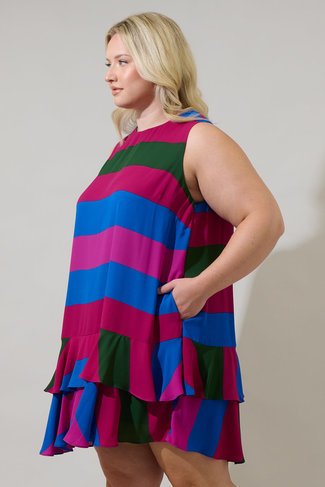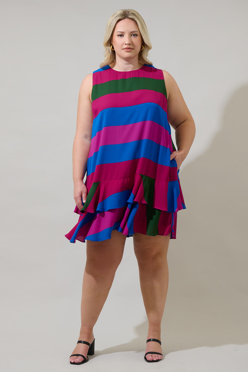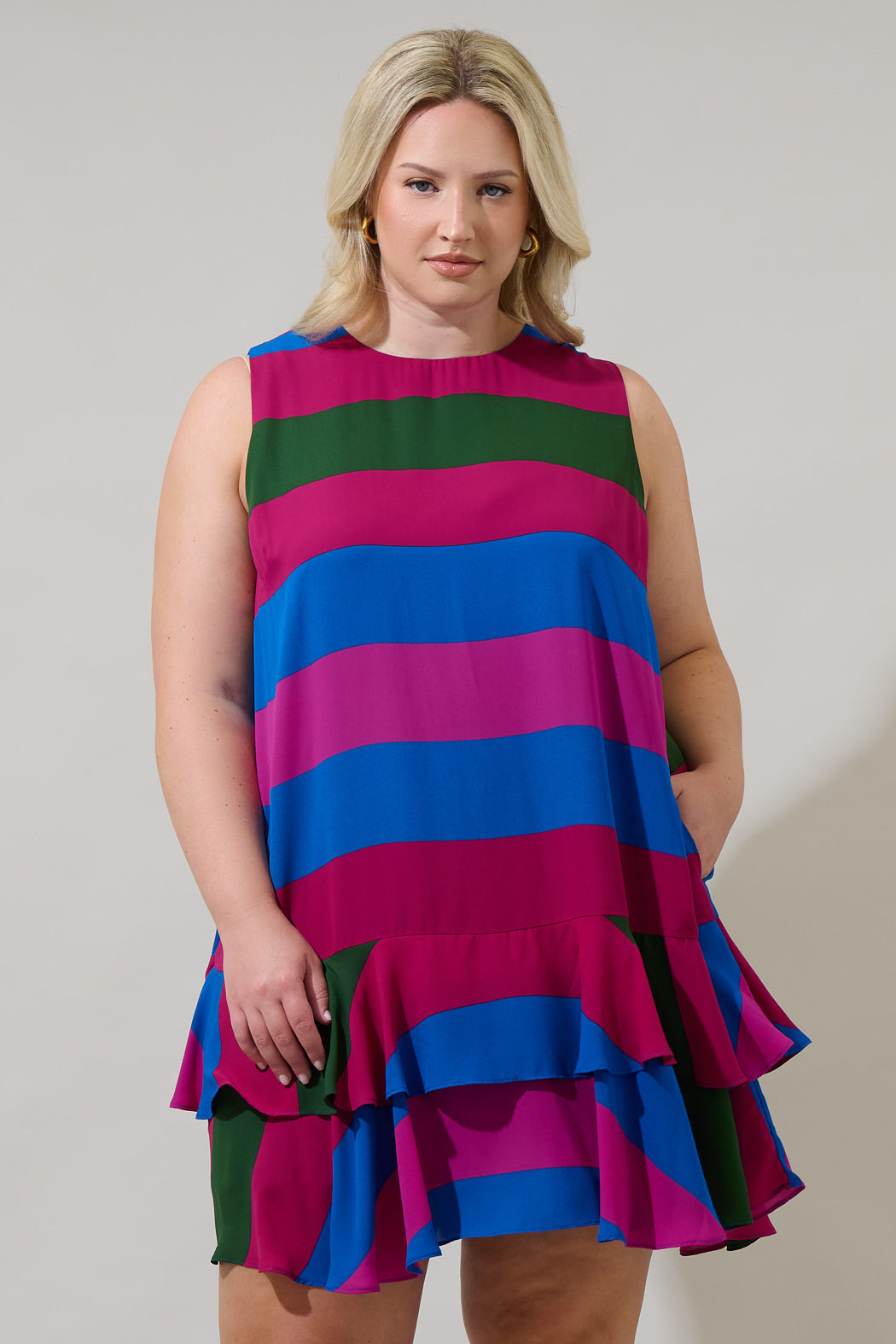 The Saige Striped Una Shift Mini Dress will make you feel like you have your own personal fashion show. It features a shift style with no sleeves, and ruffle tiers in the bottom. The back has a keyhole. Pair it with heels and fun accessories.