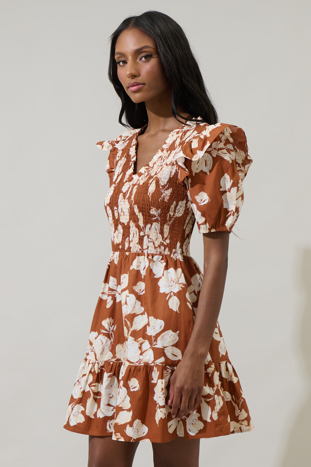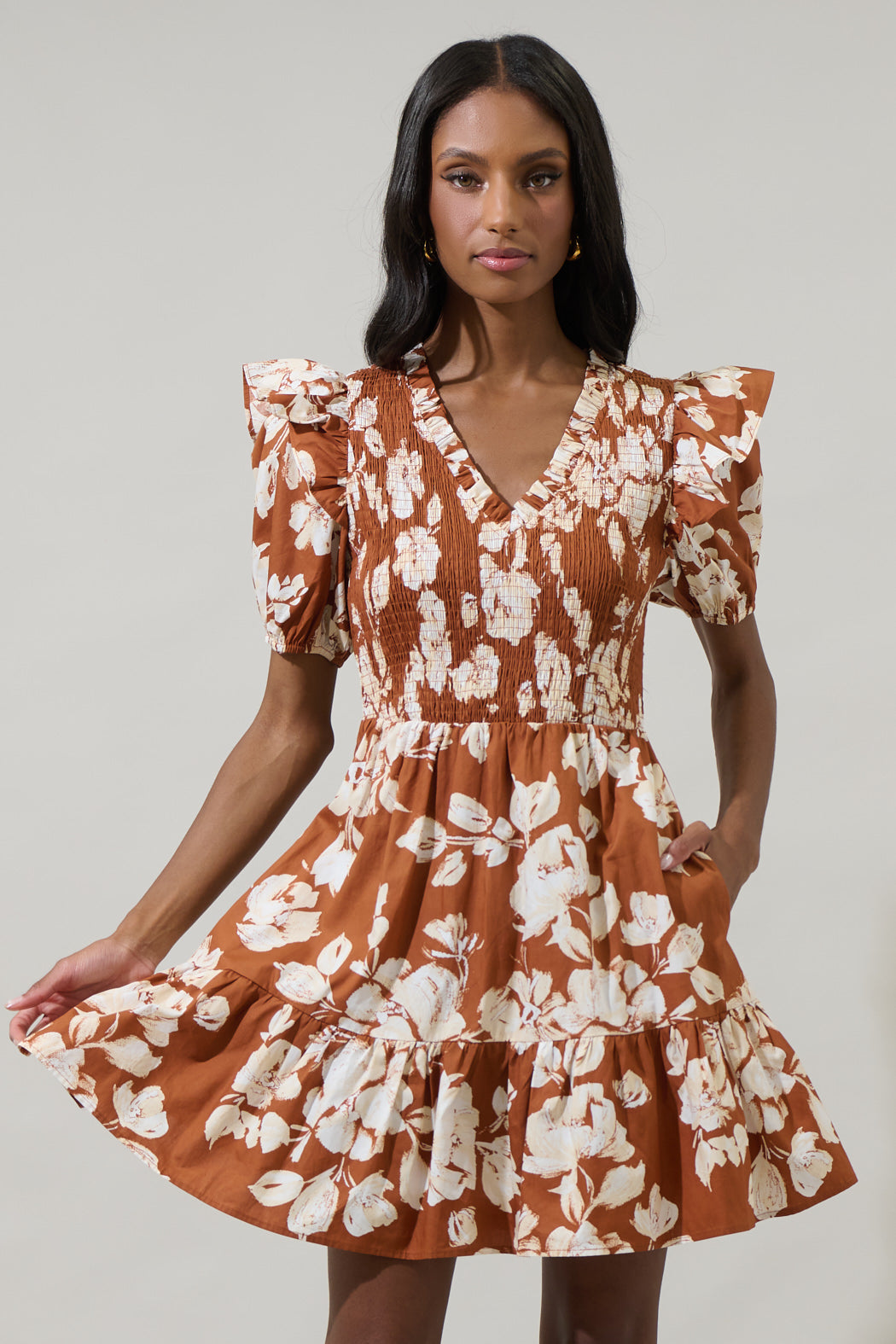 The dress for your next brunch date is our lovely Surrey Floral Leones Smocked Mini Dress. A white floral print sits on brown background with cotton fabric. Features a ruffle trim V neckline and fully smocked bodice framed by short puff sleeves. It tops a flared ruffle tier mini skirt. Wear it white loafers and gold accessories.