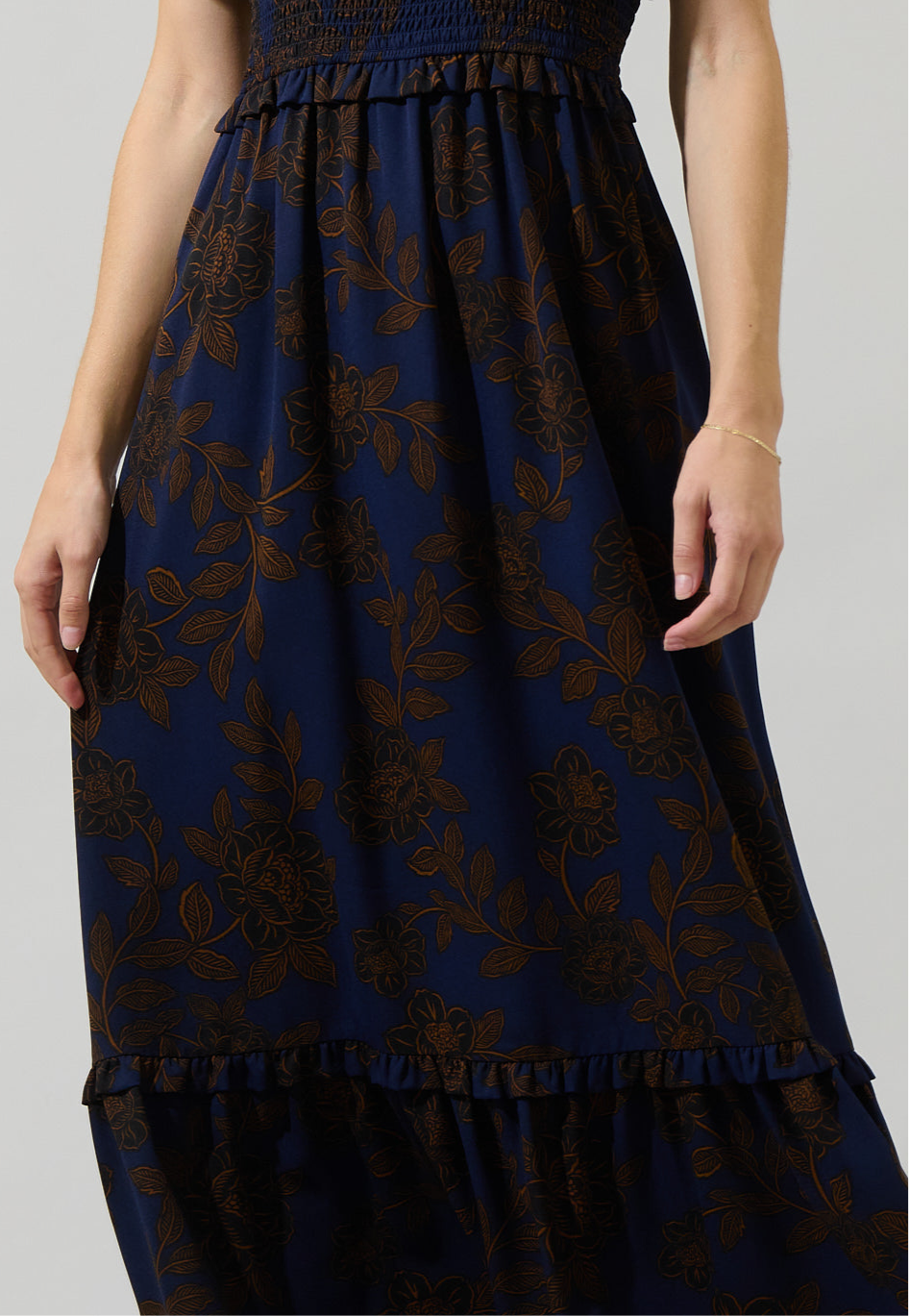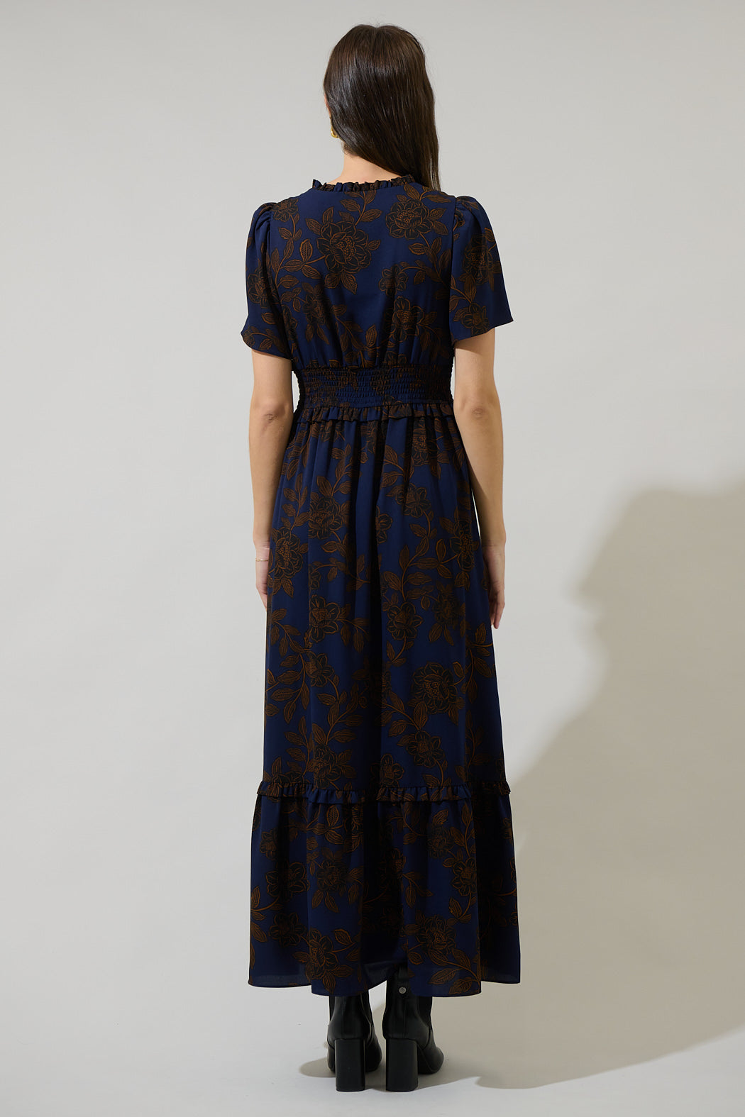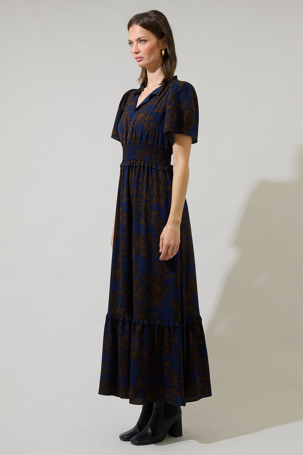 We can’t go wrong with autumn tones. This maxi dress features a brown floral design on a dark blue background. It has a split neckline, short flutter sleeves, and a smocked waist band with ruffles. Pair it with strappy heels and simple jewelry.