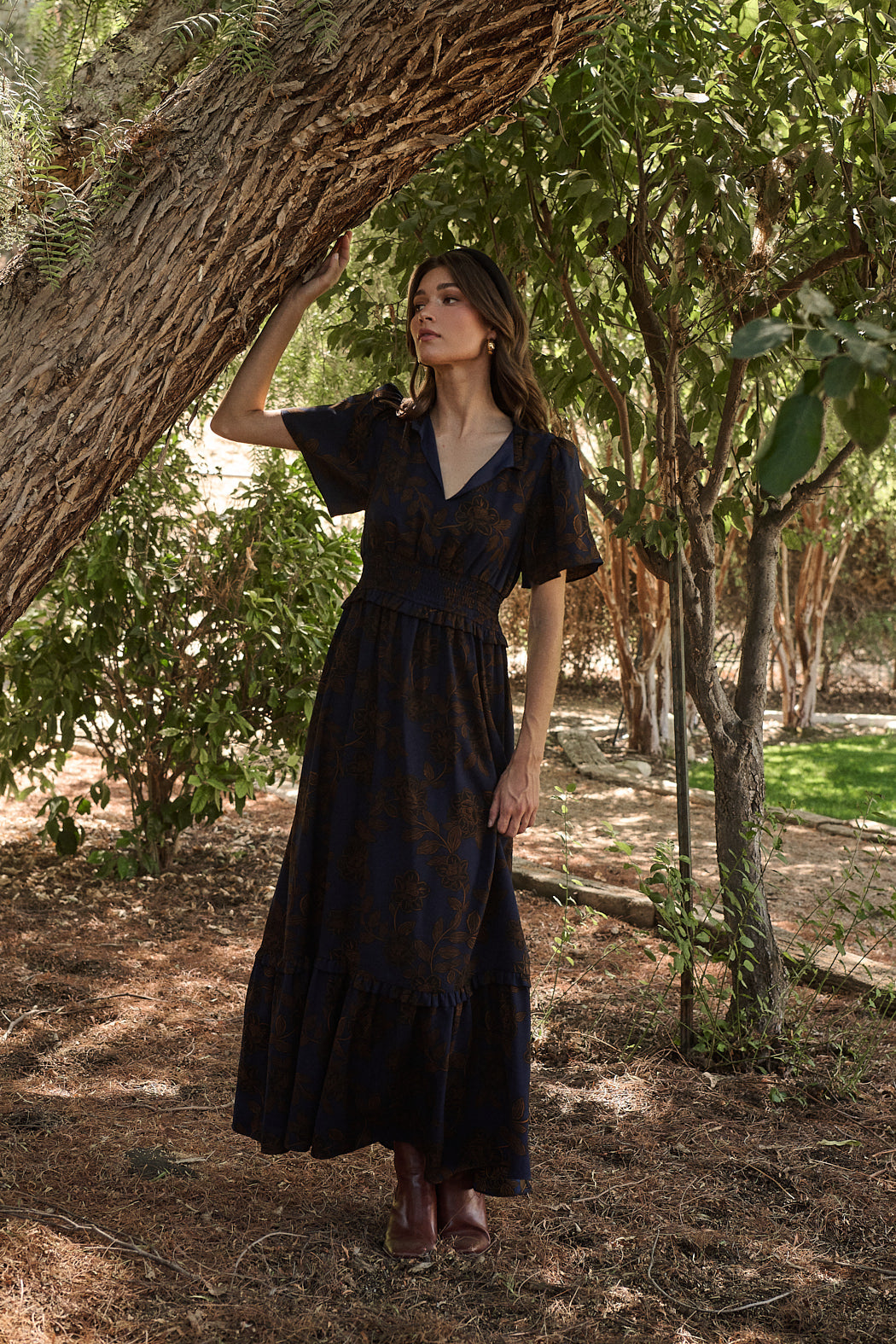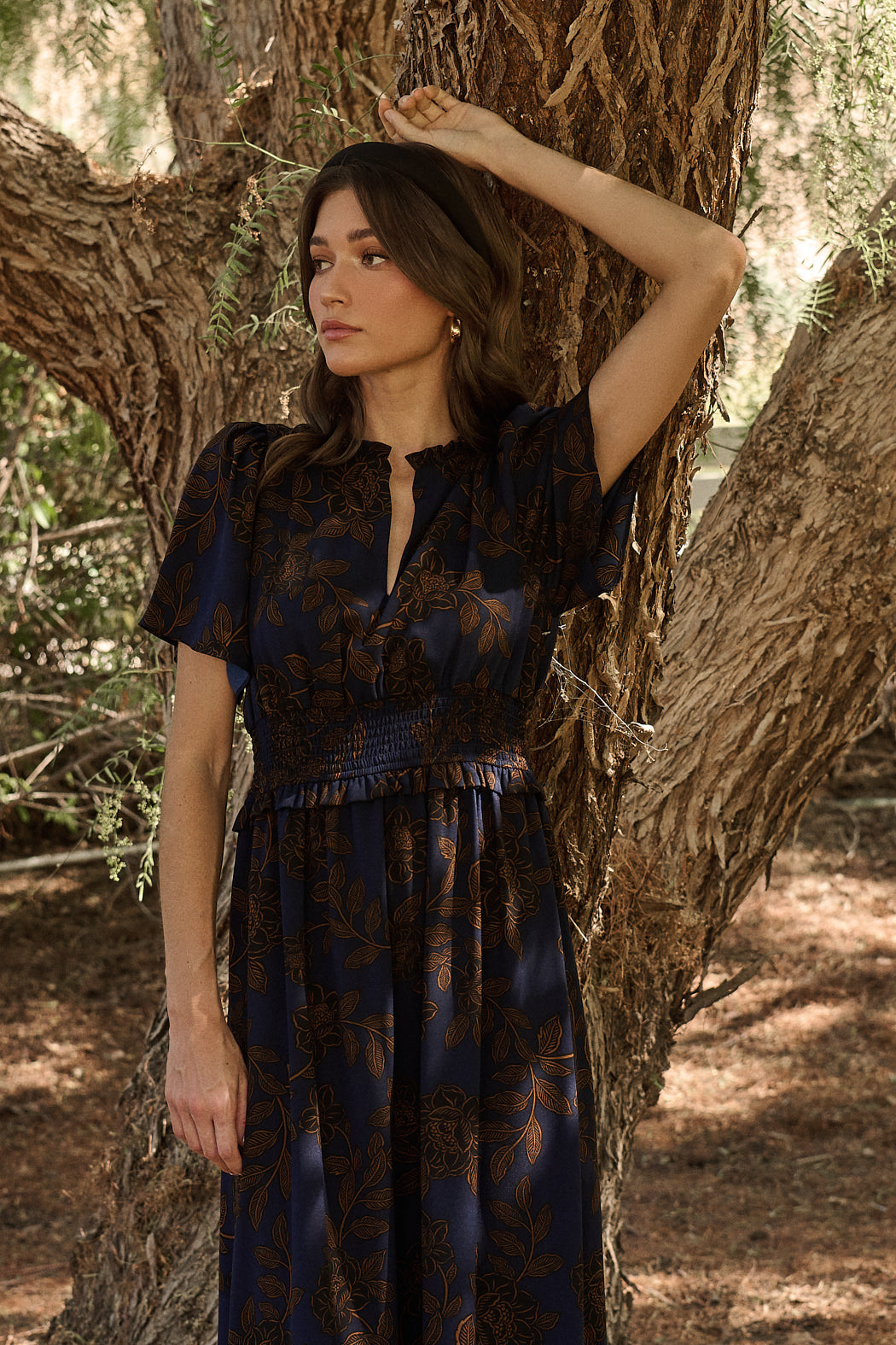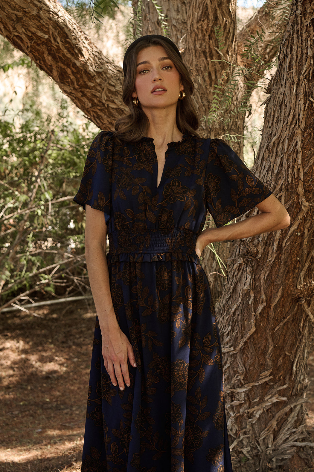 We can’t go wrong with autumn tones. This maxi dress features a brown floral design on a dark blue background. It has a split neckline, short flutter sleeves, and a smocked waist band with ruffles. Pair it with strappy heels and simple jewelry.