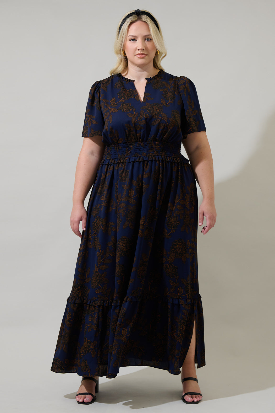 We can’t go wrong with autumn tones. This maxi dress features a brown floral design on a dark blue background. It has a split neckline, short flutter sleeves, and a smocked waist band with ruffles. Pair it with strappy heels and simple jewelry.
