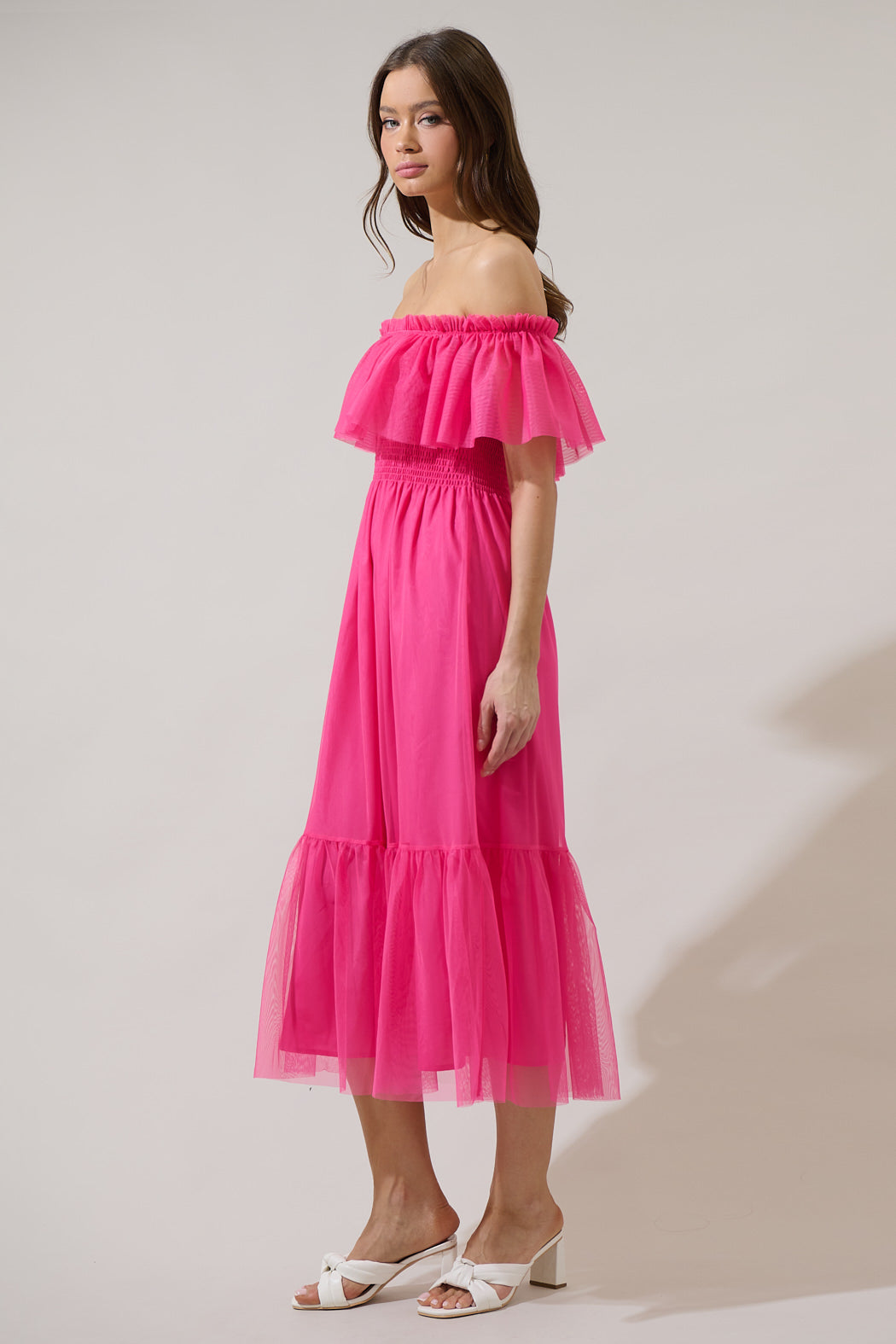 Make room in your closet for this Trace Tulle Off the Shoulder Midi Dress. This dress is featured in a trendy tulle fabric with a ruffle off the shoulder, and smocked bodice. Pair with ankle strap heels and a clutch for an everlasting look.