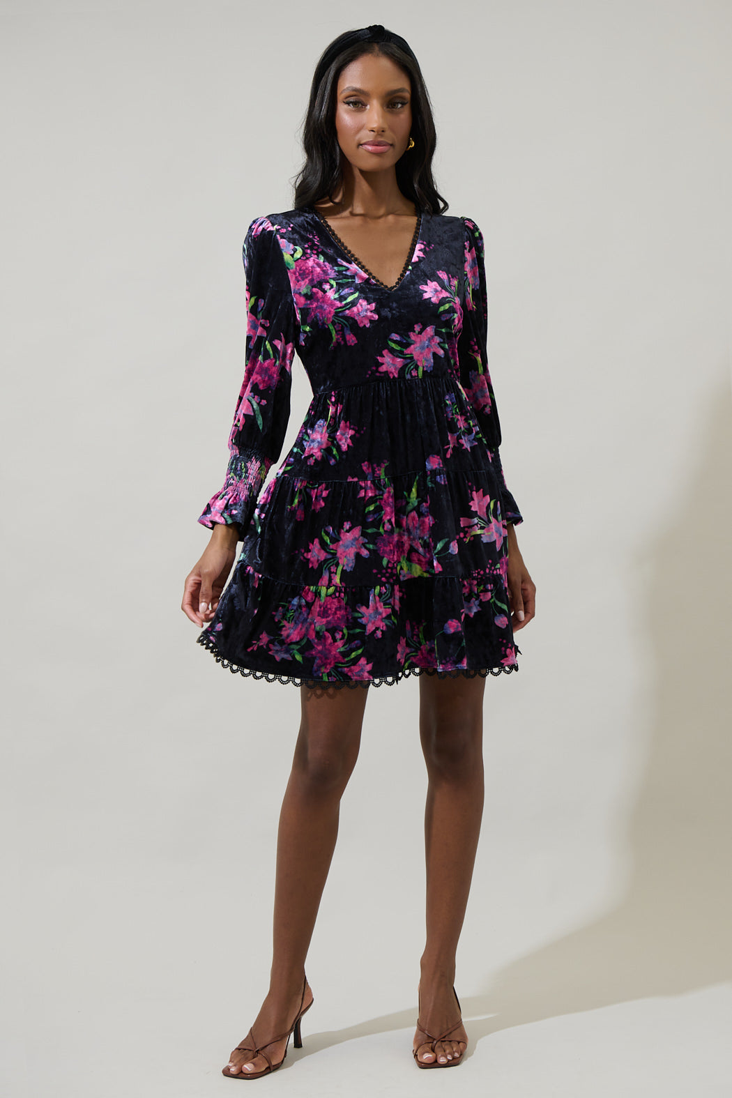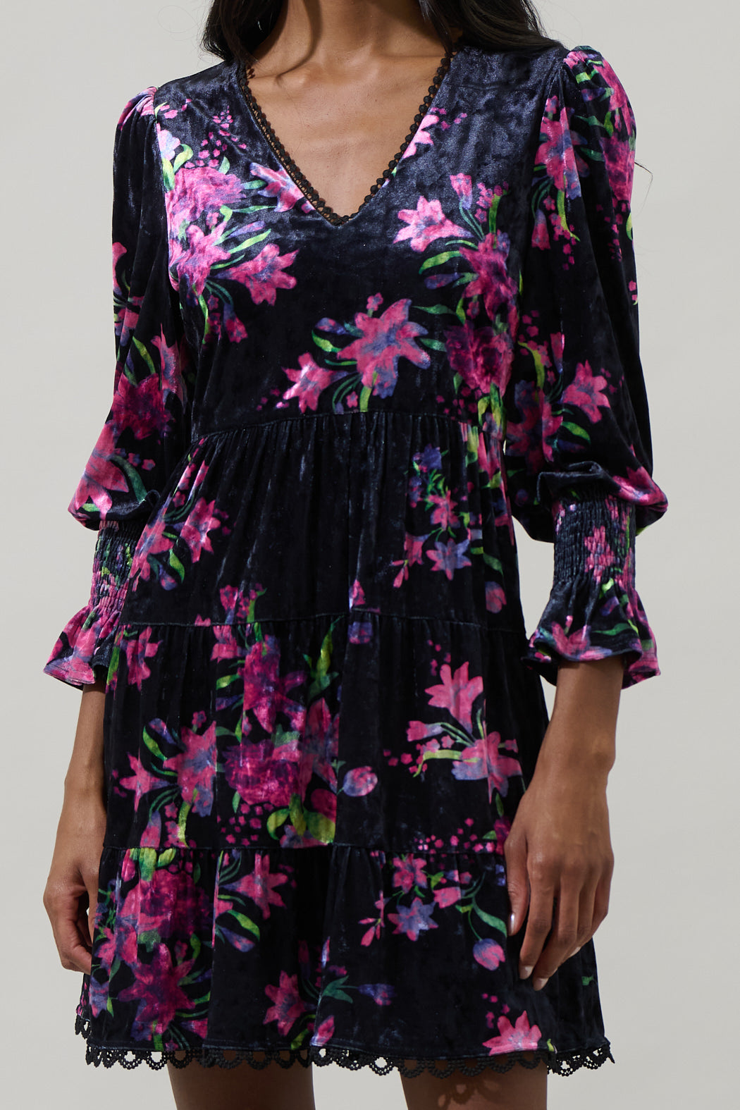 You're going to look oh so sweet in the Tulda Floral Amari Velvet Tiered Mini Dress. A beautiful pink floral print enchants this long sleeve dress with smocked cuffs, V-neck and tiered layers. Wear it with fuchsia heels to complete a look.