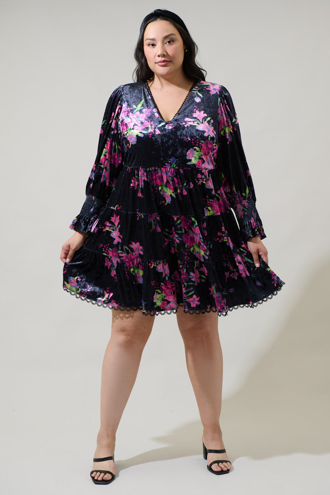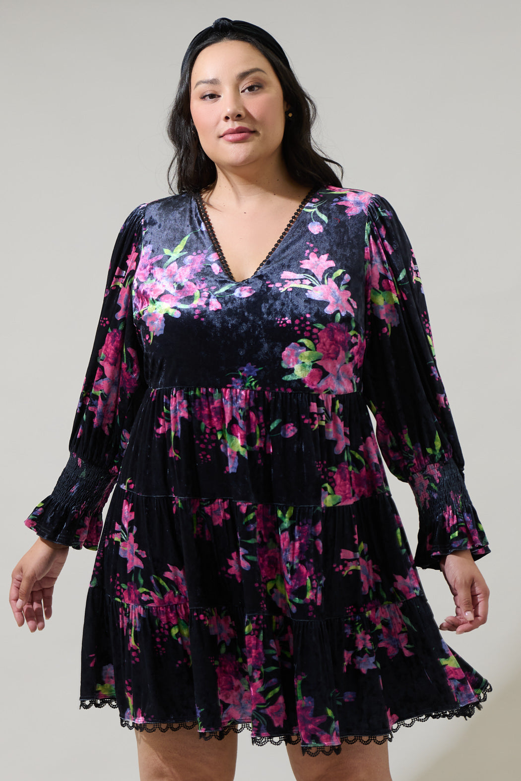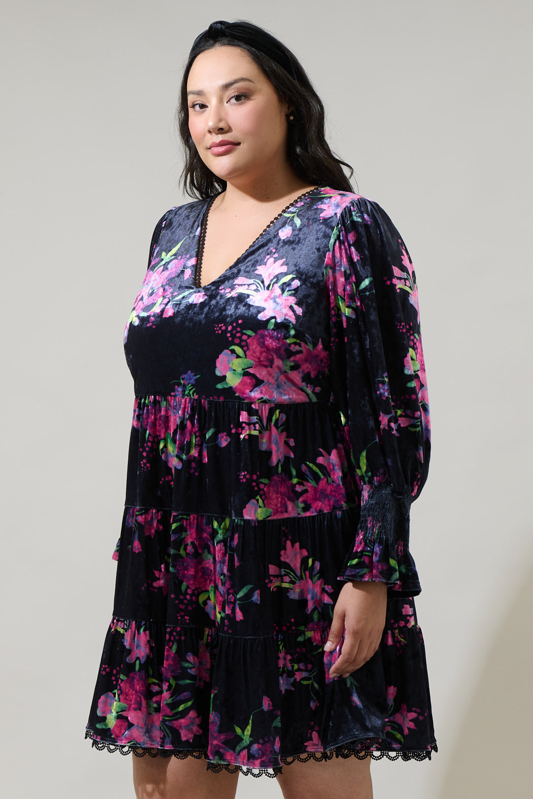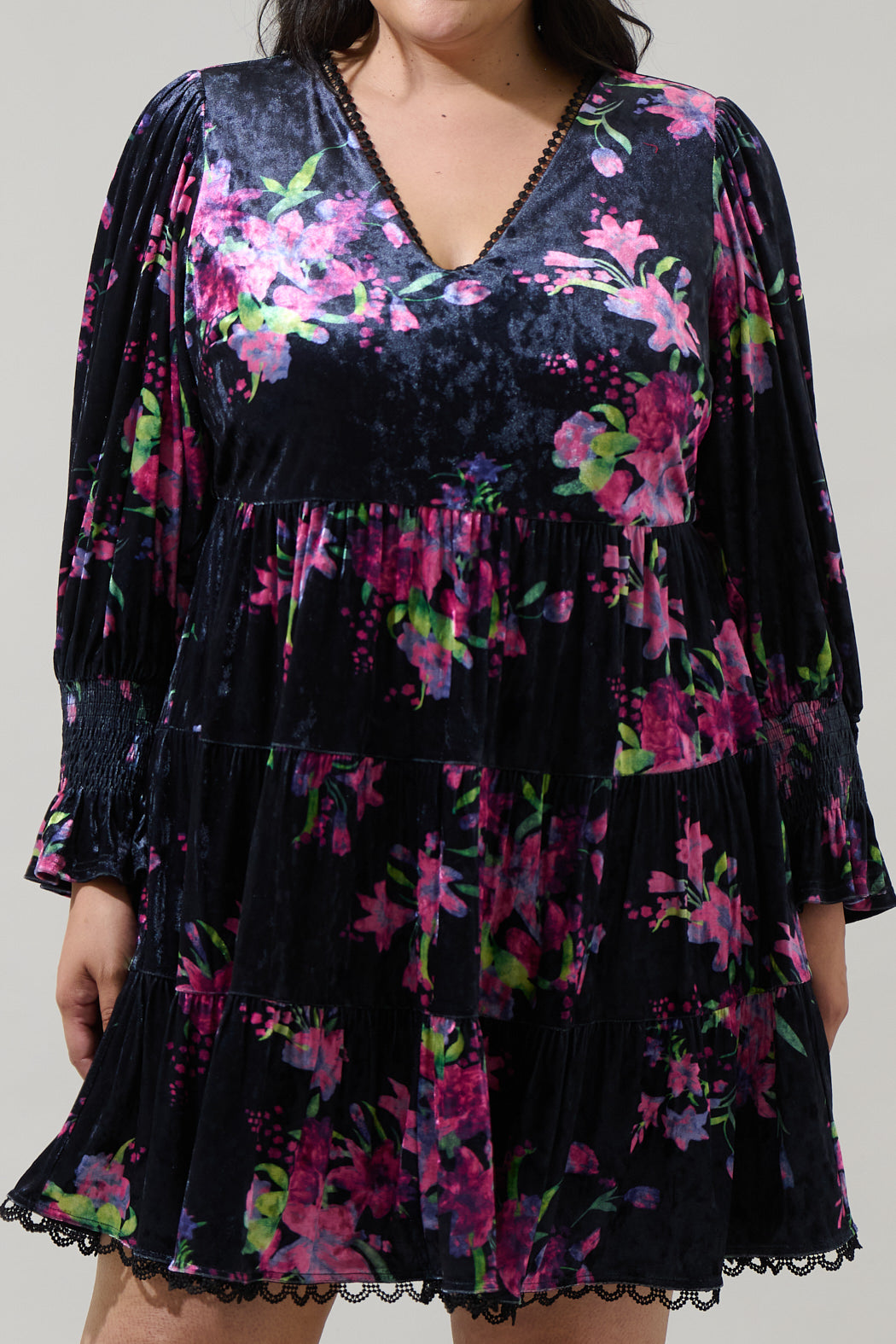 You're going to look oh so sweet in the Tulda Floral Amari Velvet Tiered Mini Dress Curve. A beautiful pink floral print enchants this long sleeve dress with smocked cuffs, V-neck and tiered layers. Wear it with fuchsia heels to complete a look.