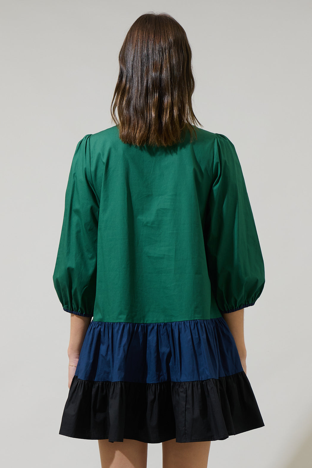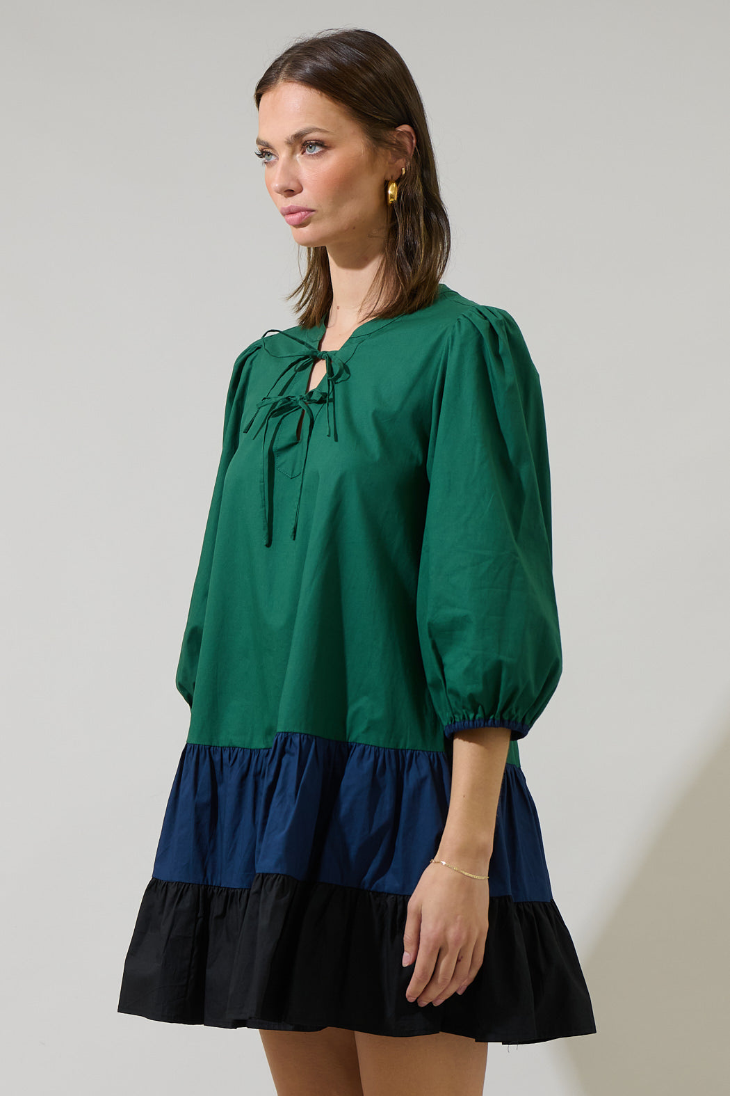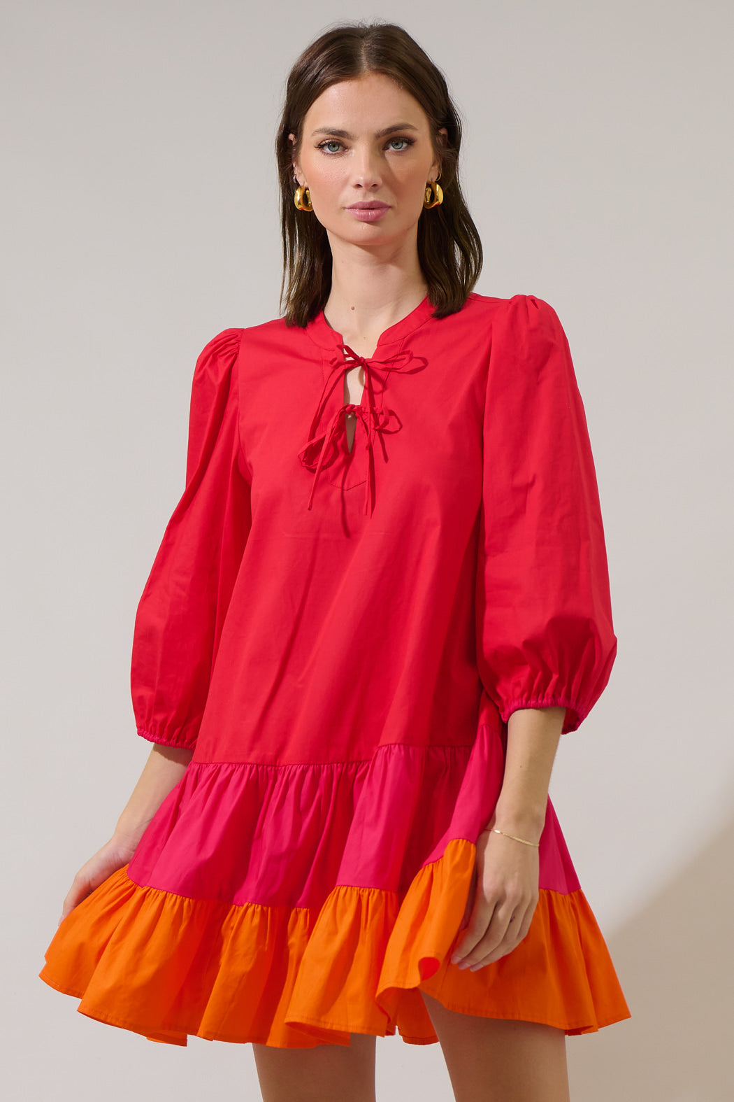 Stroll around under the sun with the Woodlake Color Block Tiered Mini Dress. Long sleeves with elastic cuffs feature a split neckline with string ties. It has a low waist with tiered layers. Pair it with cute sandals or wedges for an easy comfy look.