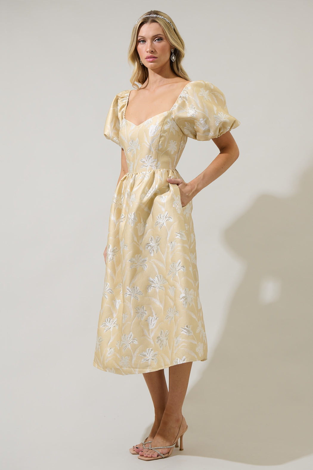 Catch all eyes on you, when you wear the Zarah Jacquard Alessi Puff Sleeve Midi Dress. This romantic dress features short puff sleeves that frame a sweetheart neckline and a fitted bodice with princess seams for a shapely fit. A smocked back and invisible zipper allow for easy mobility, as well as a flowy A line skirt. Complete the look with open toe heels.