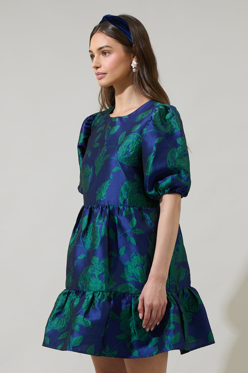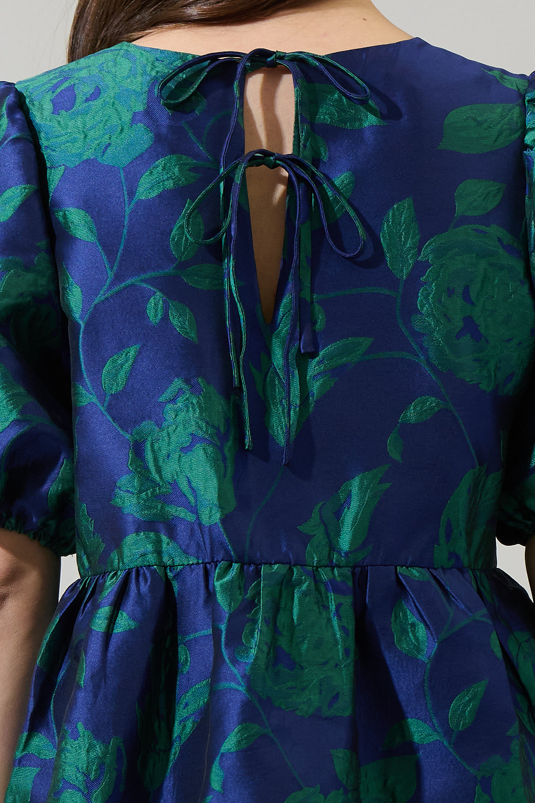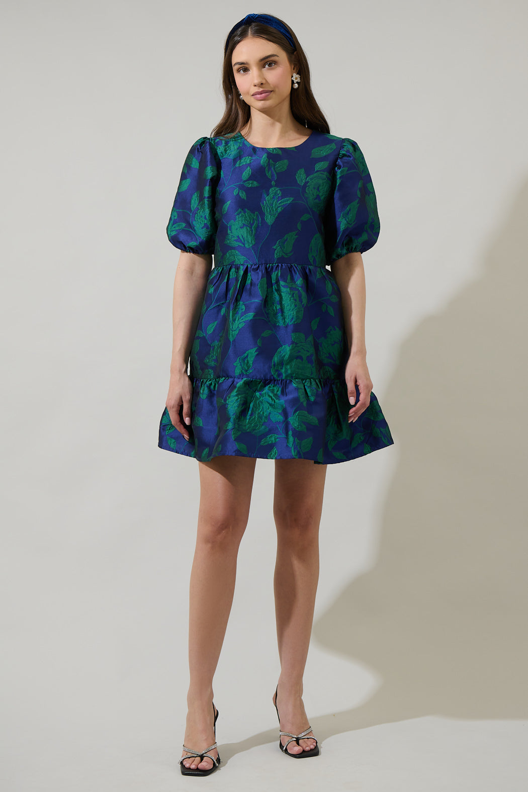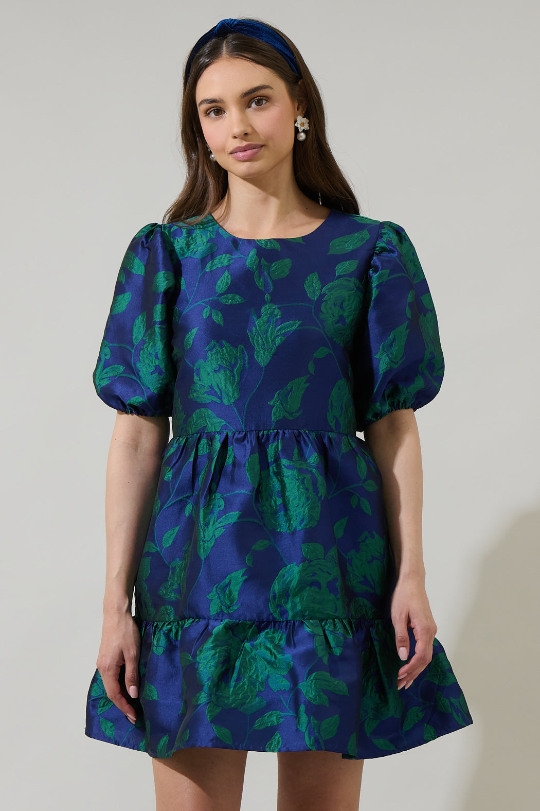 Make a grand entrance and a memorable night in the Zoe Jacquard Mila Bubble Sleeve Mini Dress. A navy background with green florals decorates this short bubble sleeve dress with a round neckline. The back has two ties with a keyhole. Add on silver accessories and matching heels for a finished look.