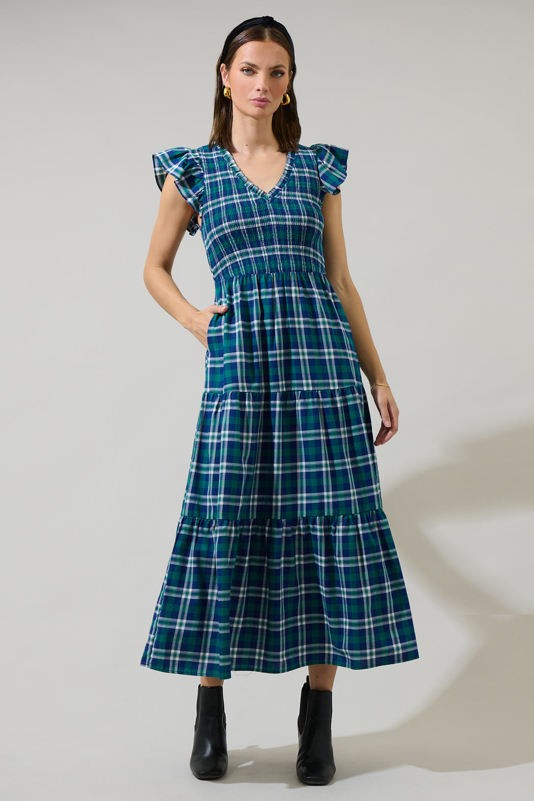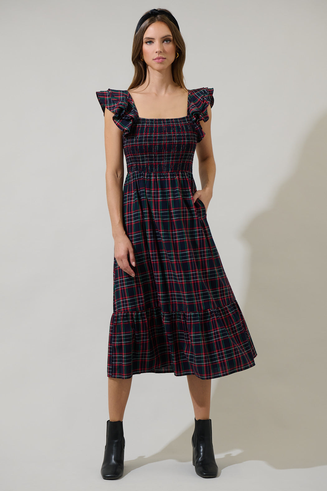 Chapman Plaid Girona Smocked Ruffle Midi Dress